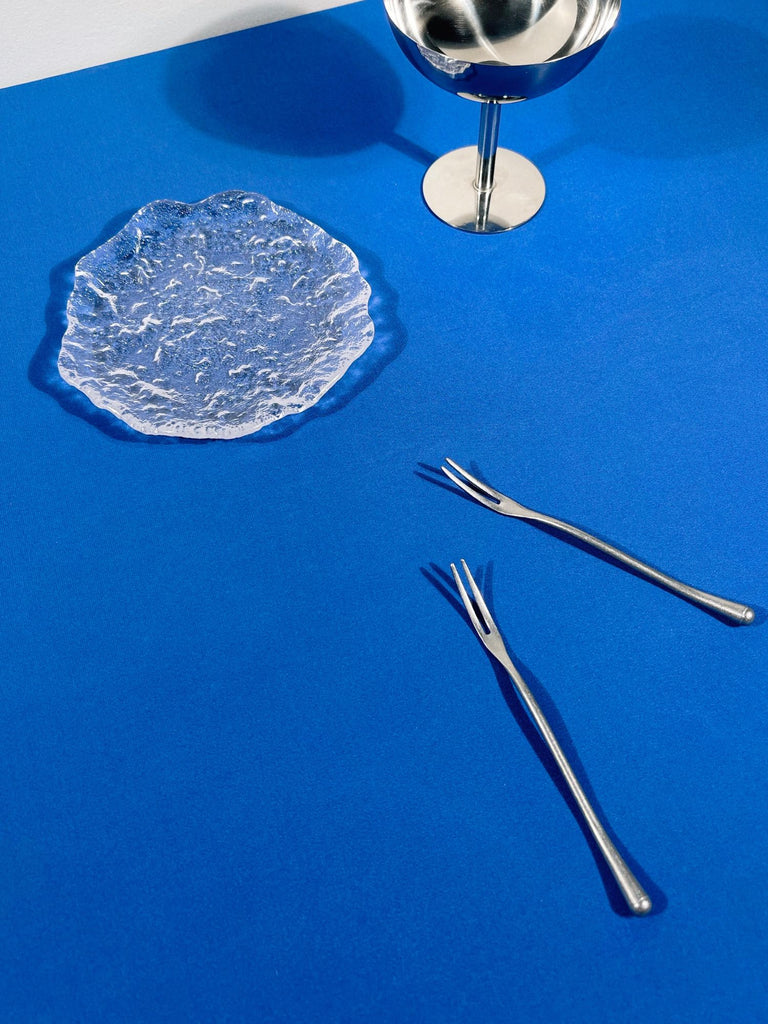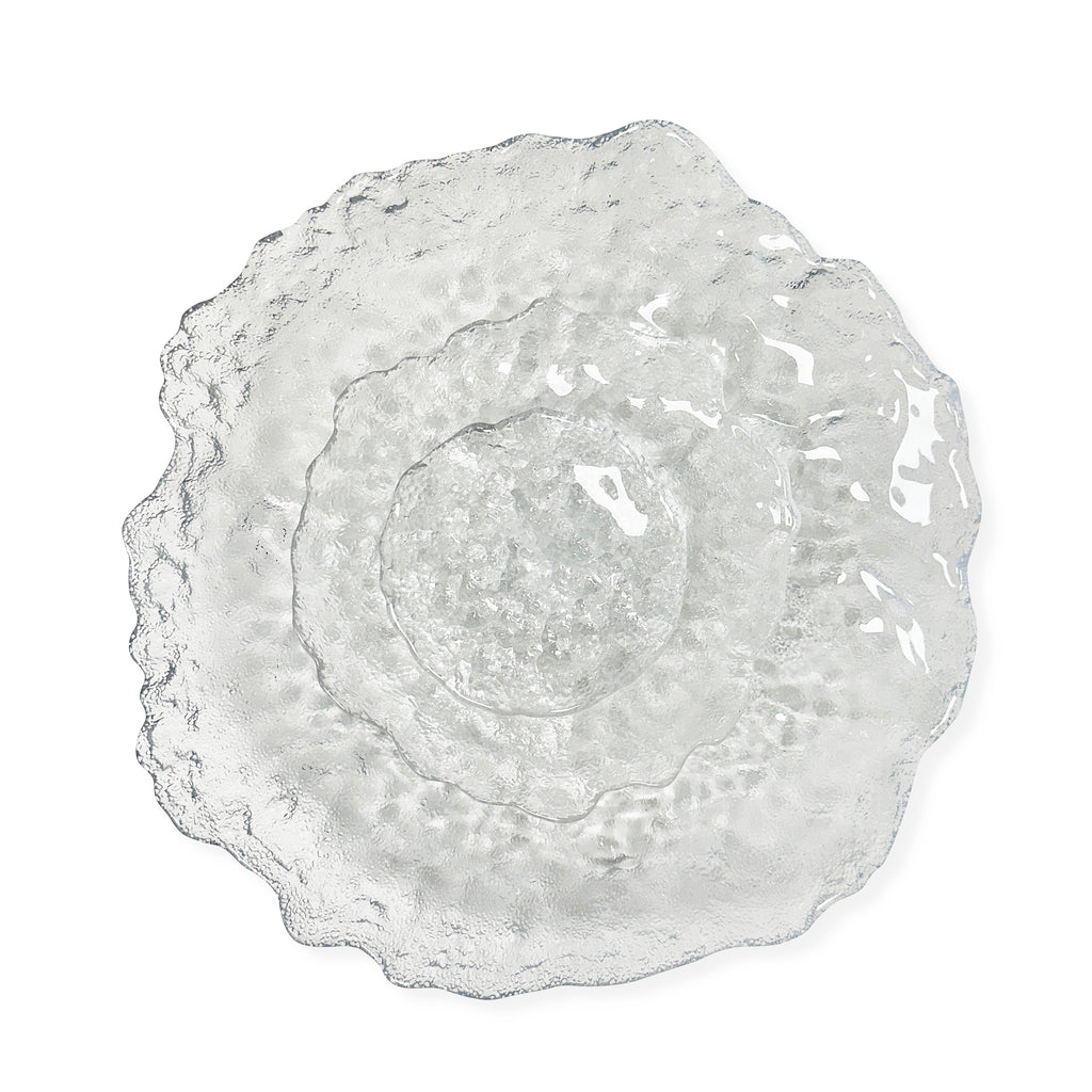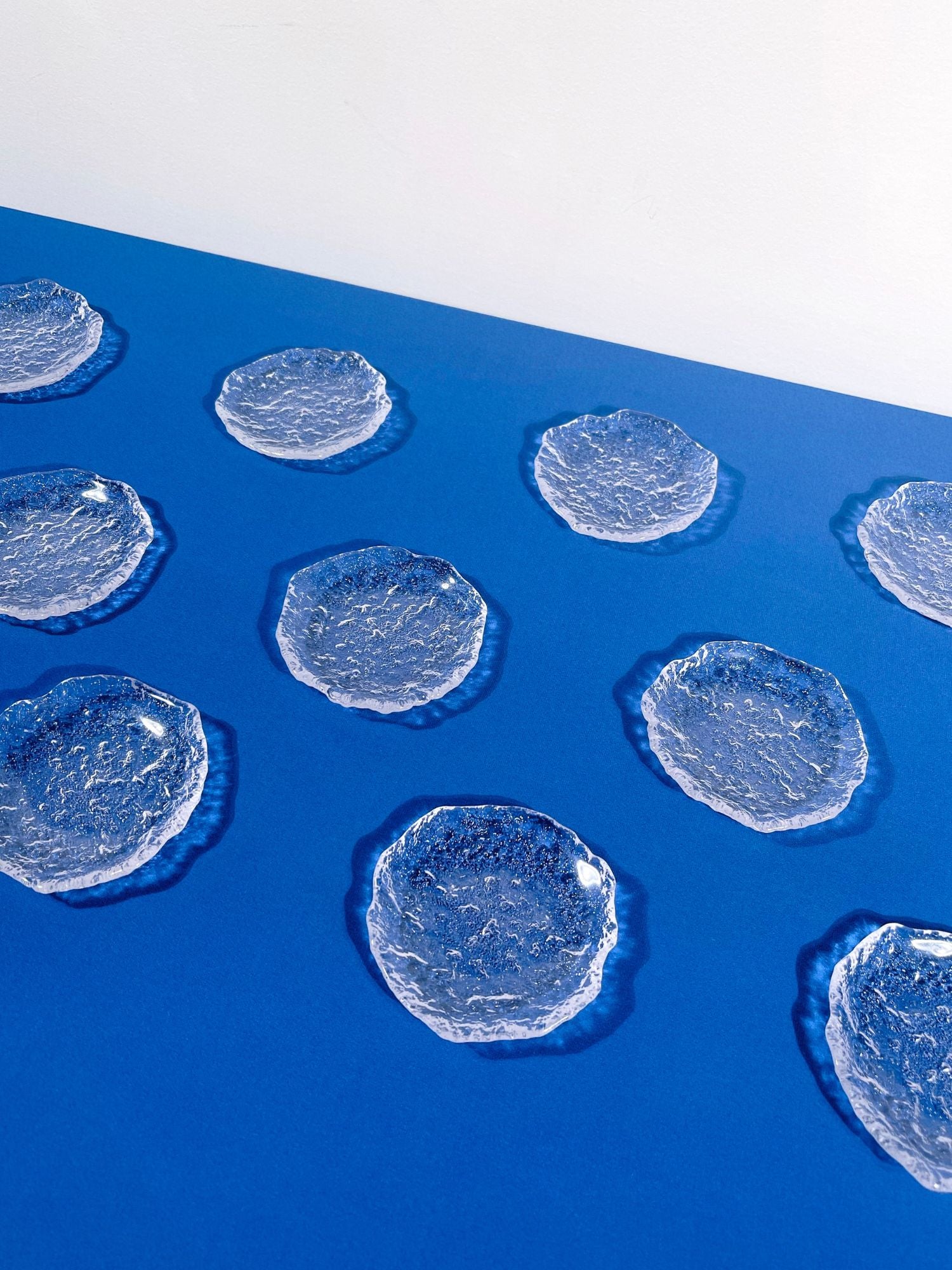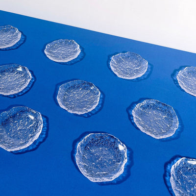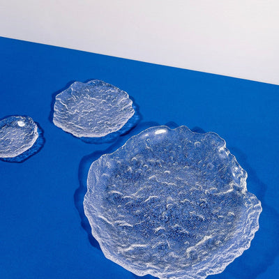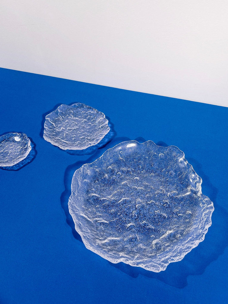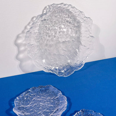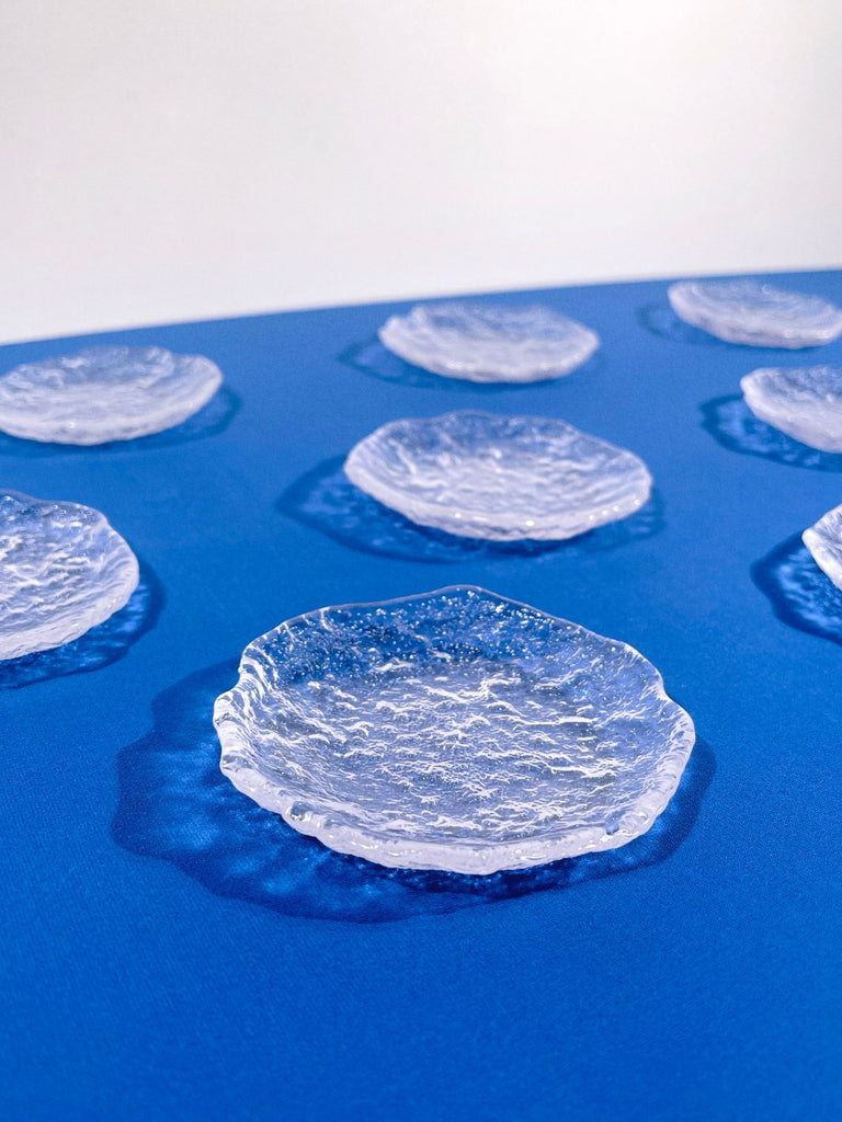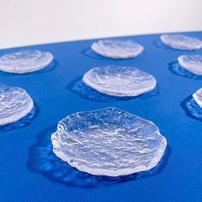 The Ocean Plates, a part of the OCEN series by Hōmu - a modern take on Japanese glassware. Each piece is a unique work of art, expertly crafted to mirror water and ice, featuring the HOMU logo gently etched into the top of each piece. Mix our range of bowls and plates to create an OCEN-themed kaiseki.