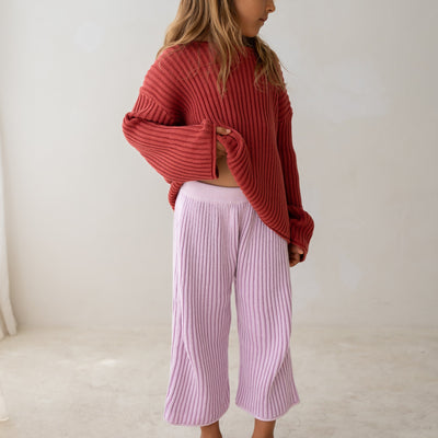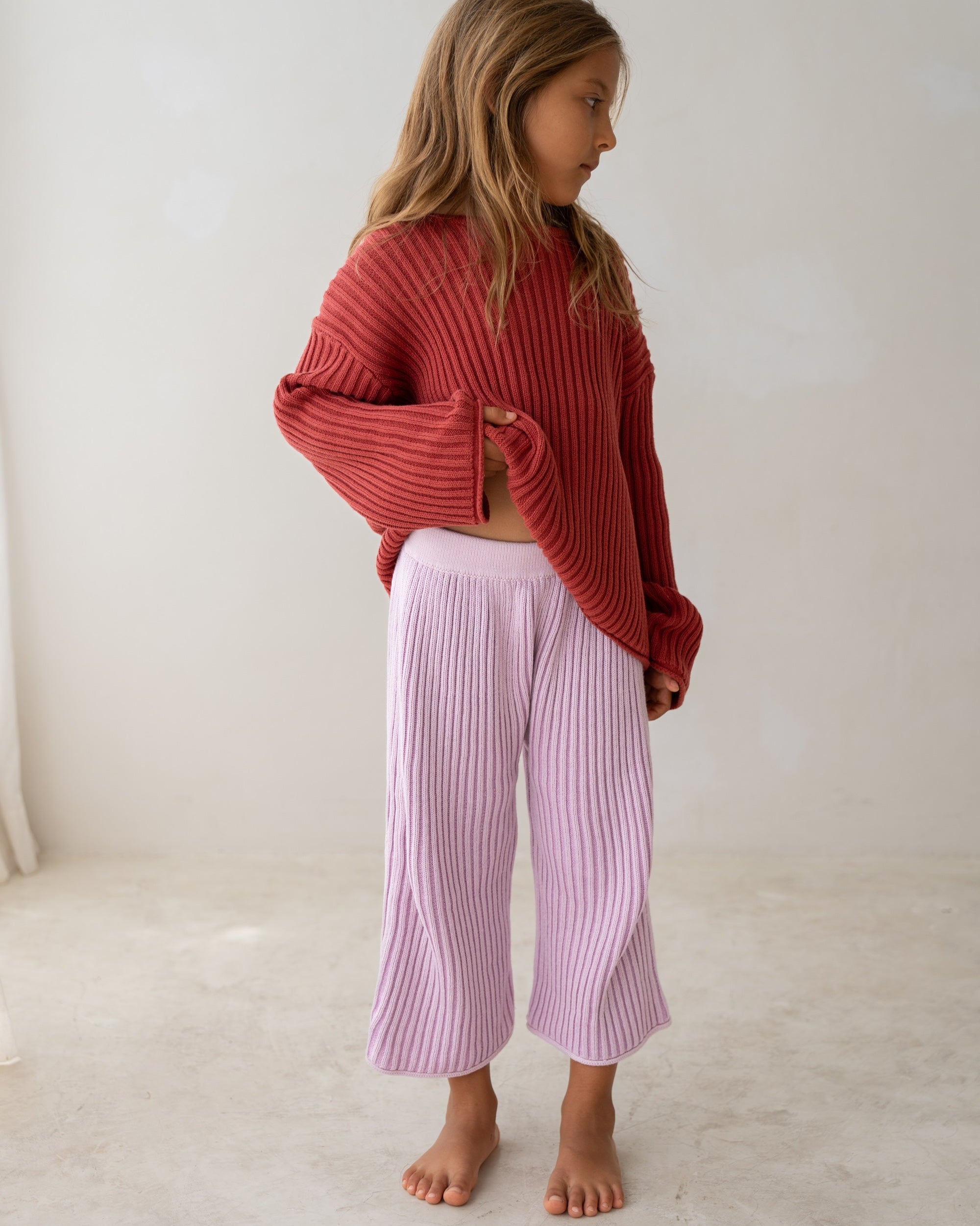 Comfort meets effortless style with the Knit 3/4 Flared Pants by Illoura, now in a dreamy Mauve Stripe. These 3/4 flares offer an easy pull-on elasticated waist and a raw roll-over hem and are crafted in a rib that gives a stripe two-tone look. Designed for little ones who love to move, play and explore. Pair with the Knit Jumper for the full fit.