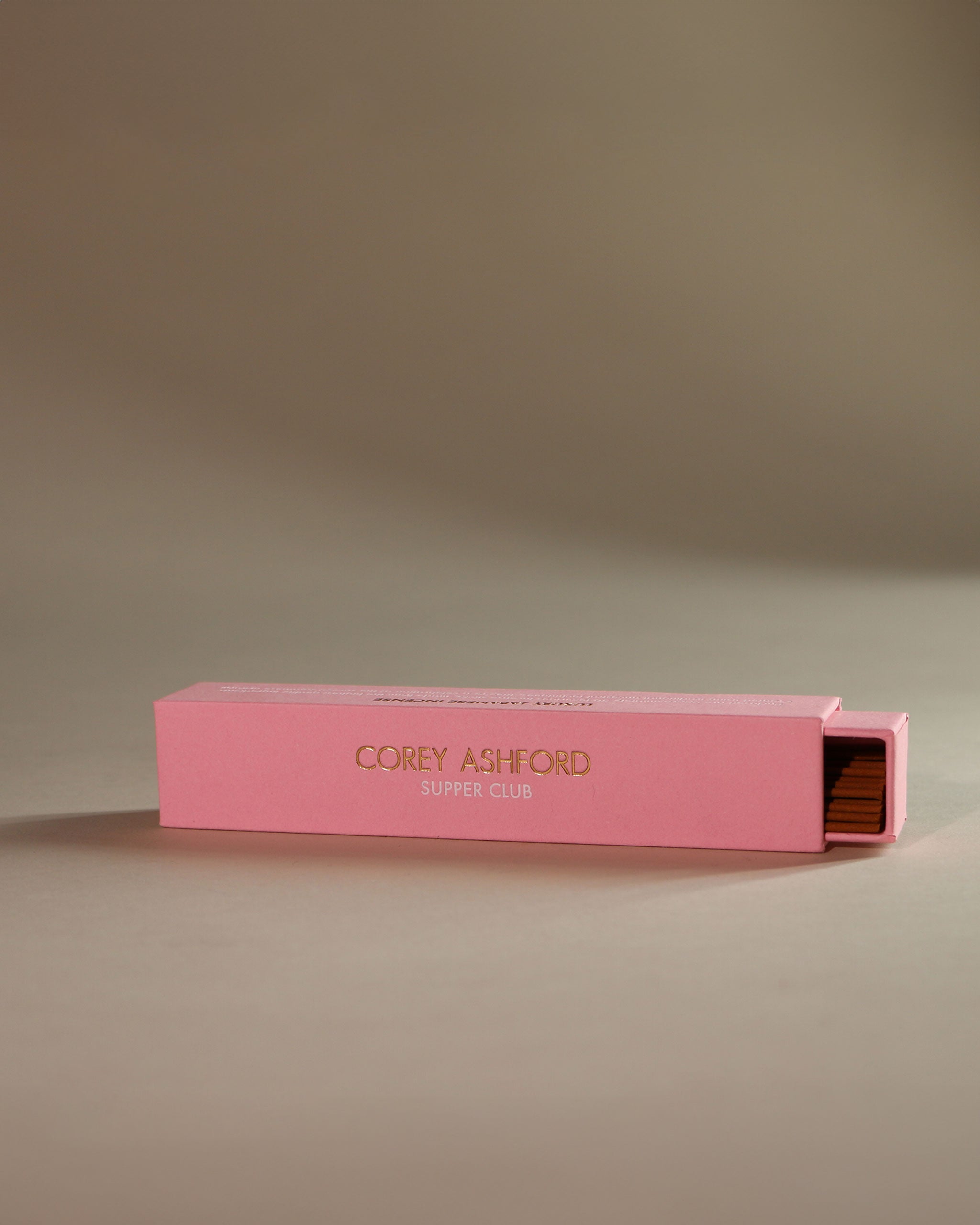 Supper Club incense by Corey Ashford captures the ambience and grandeur of an old-school supper club. Corks pop and sweet cocktails are sipped, embraced by a warm, smoky interior of dark woods and plush suede booths.