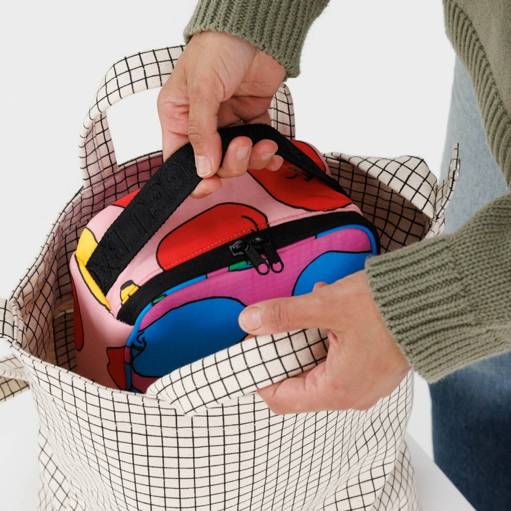 The Lunch Box in Apples & Bananas by BAGGU is an insulated zippered cooler bag that fits into your bag or backpack to keep your meal cool and cushioned. It features a handle on one end for easy carrying.
