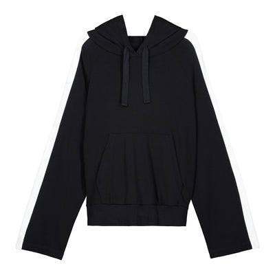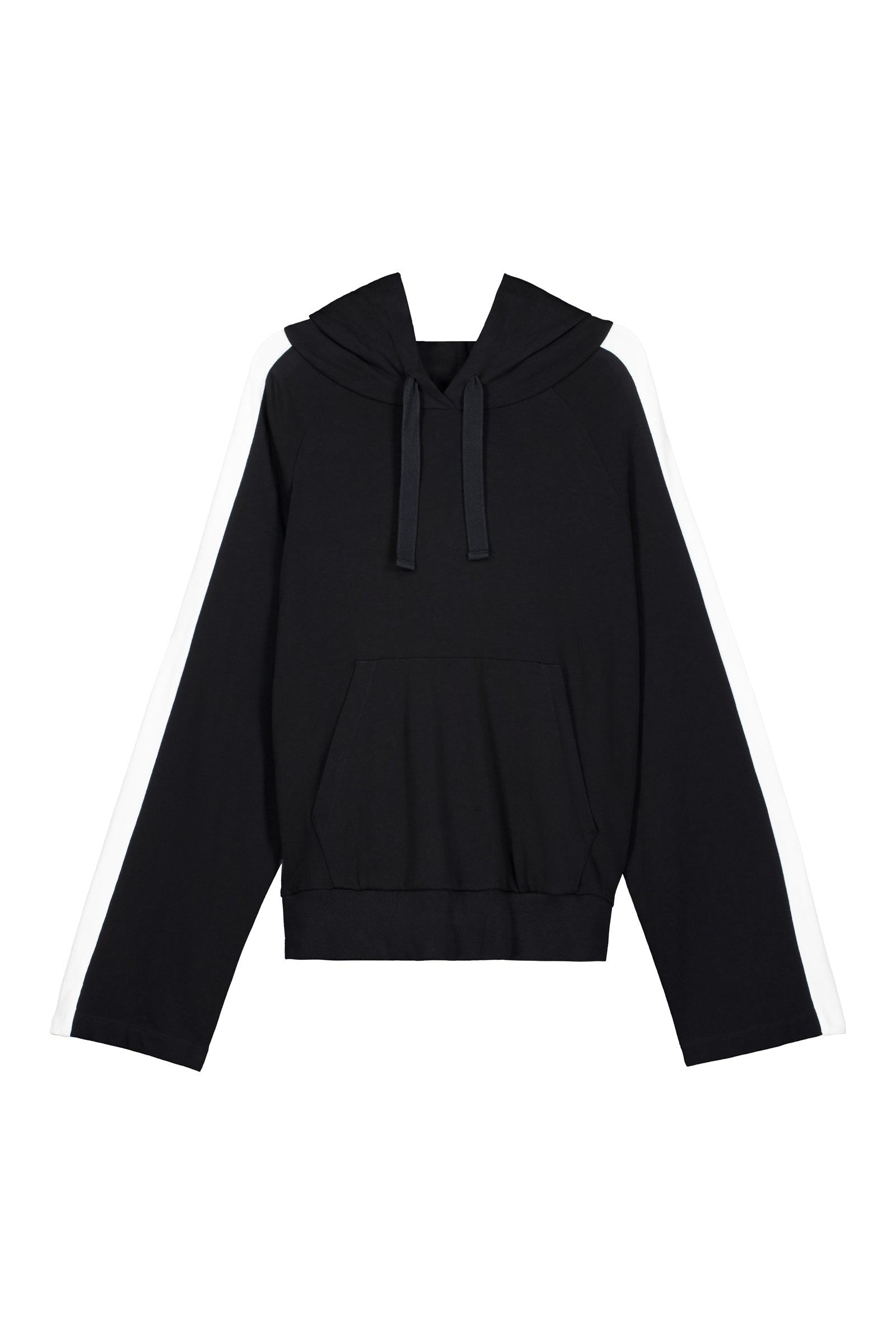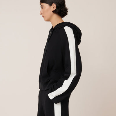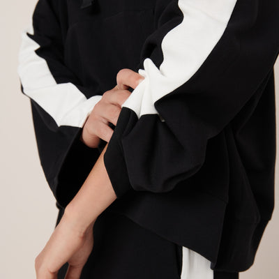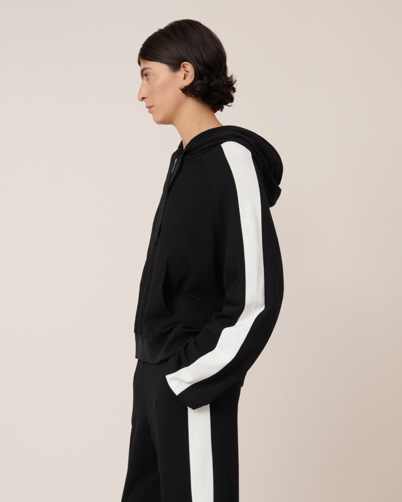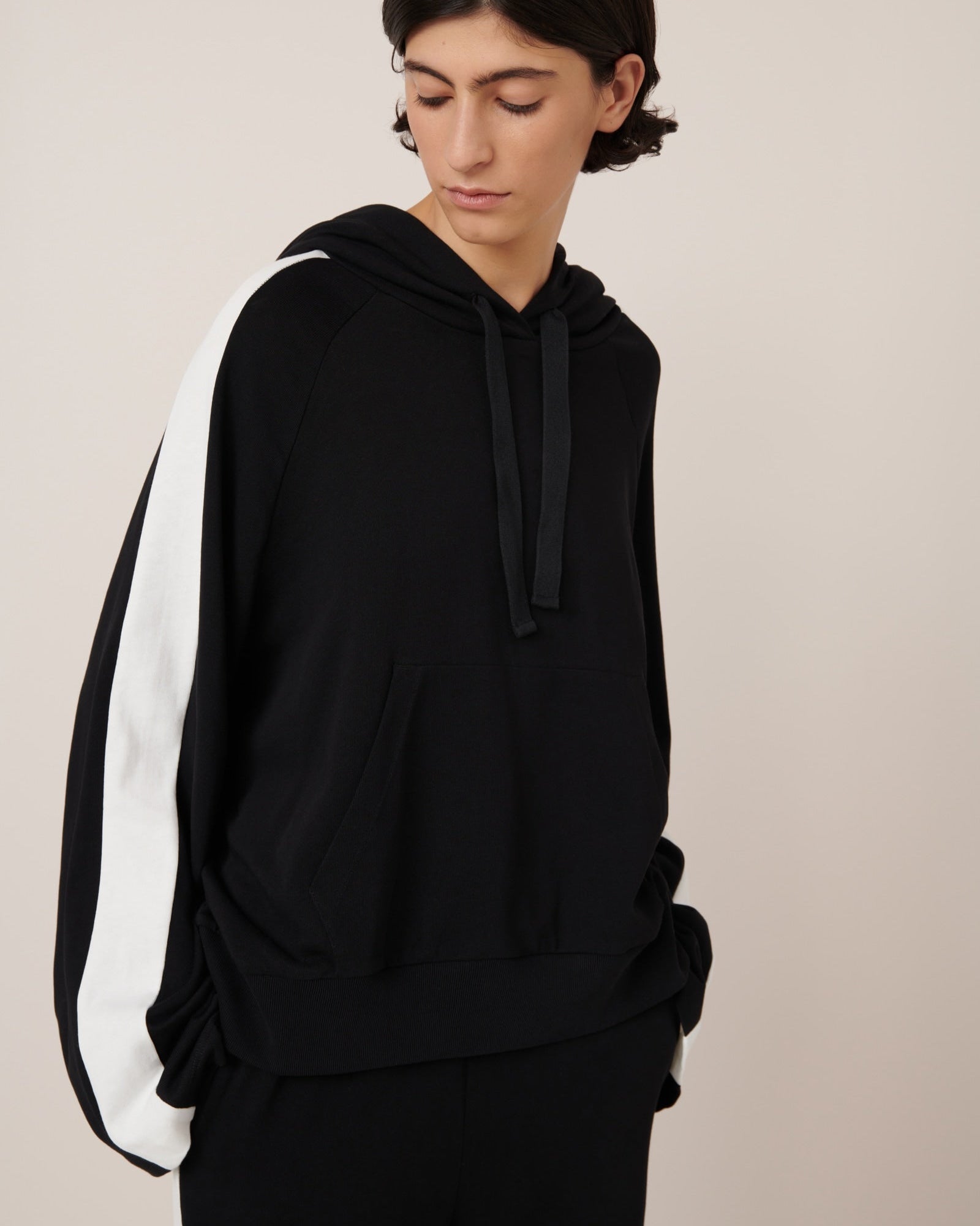 The Contrast Hoodie by Kowtow offers an oversized fit and is detailed with an exaggerated contrast greige stripe down the sleeves. Crafted from heavyweight organic cotton jersey, it features raglan sleeves, a functional drawcord through the hood and a front patch pocket. Wear on its own or pair with the Contrast Trackpant.