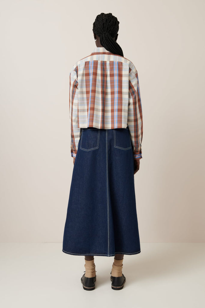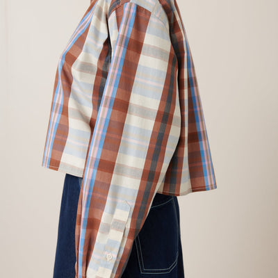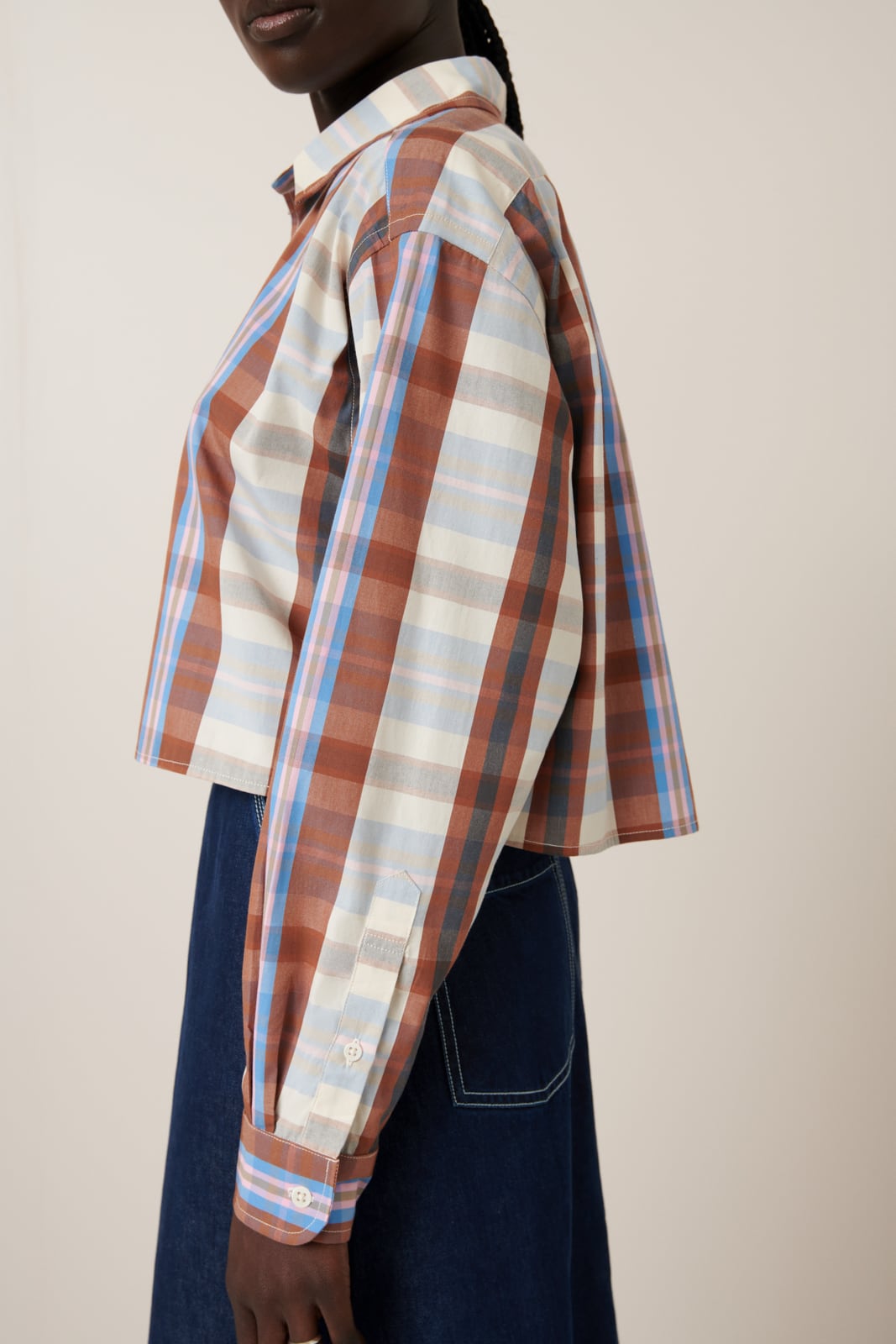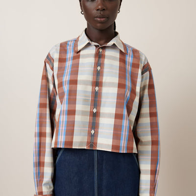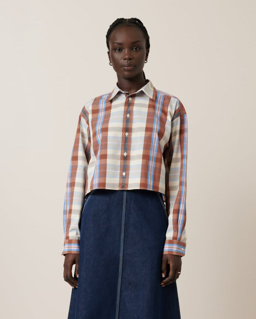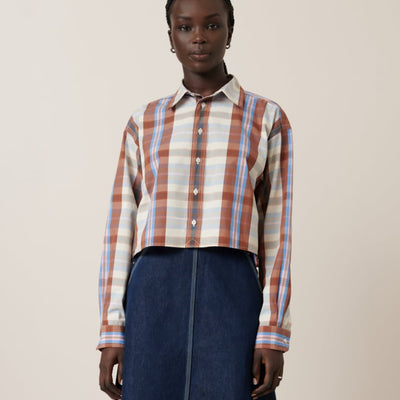 A modern twist on a classic silhouette, the Lauren Shirt in Terra Check by Kowtow is a boxy, cropped style with a relaxed fit. Featuring a classic shirt collar, and pleated cuffs and is finished with nut buttons. Style with tailored trousers for a polished look or with denim for a casual outfit.