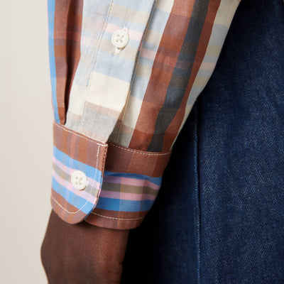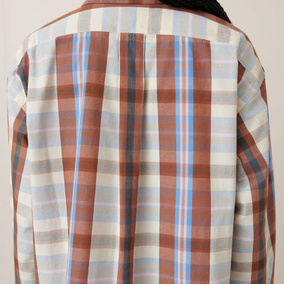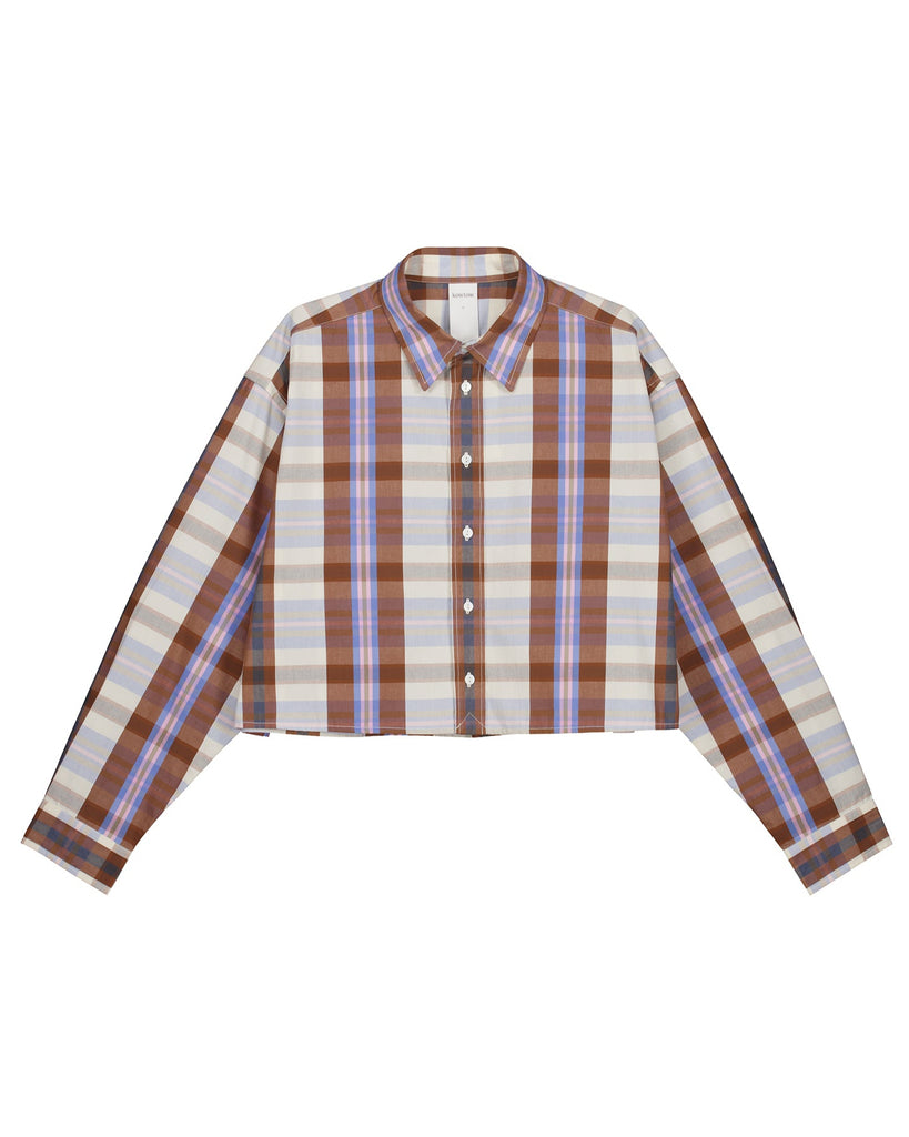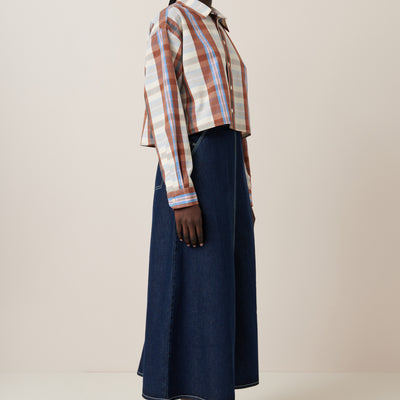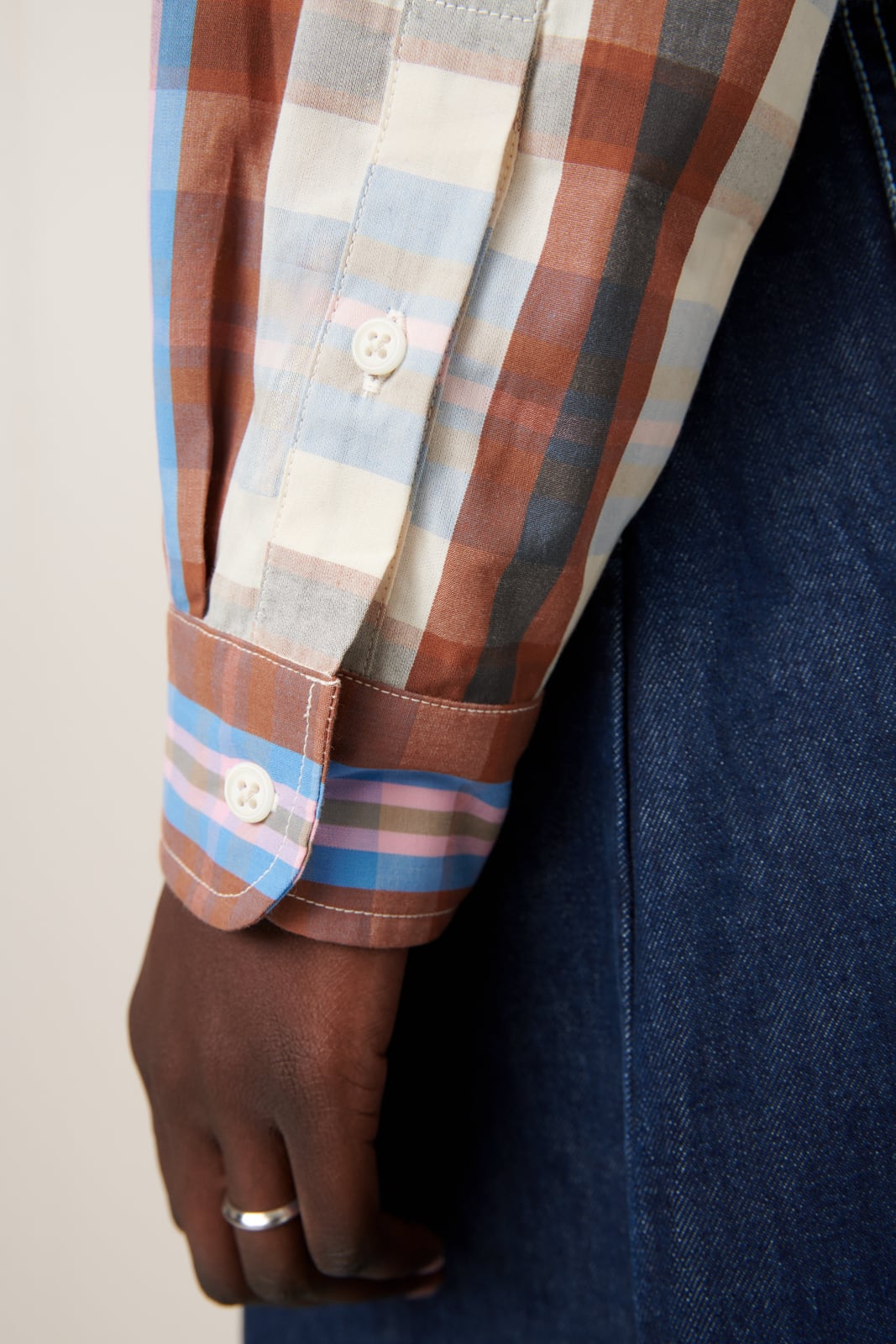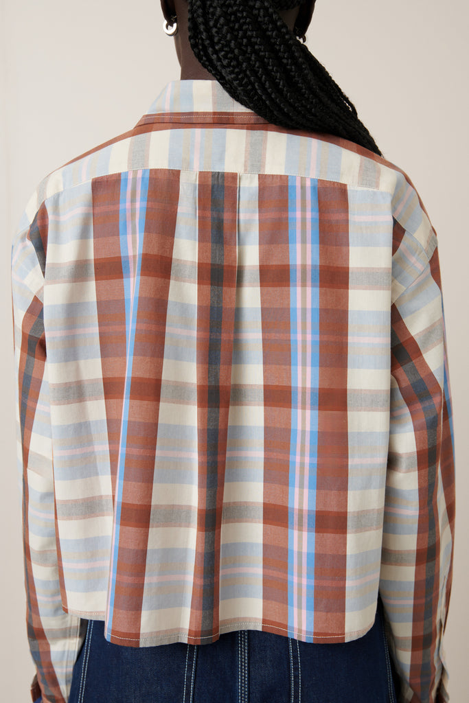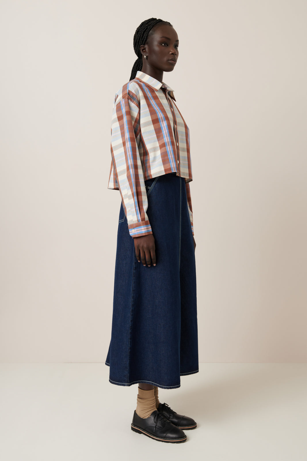 A modern twist on a classic silhouette, the Lauren Shirt in Terra Check by Kowtow is a boxy, cropped style with a relaxed fit. Featuring a classic shirt collar, and pleated cuffs and is finished with nut buttons. Style with tailored trousers for a polished look or with denim for a casual outfit.