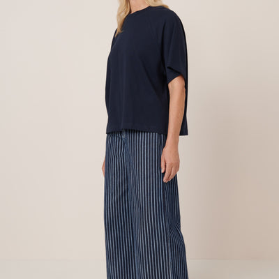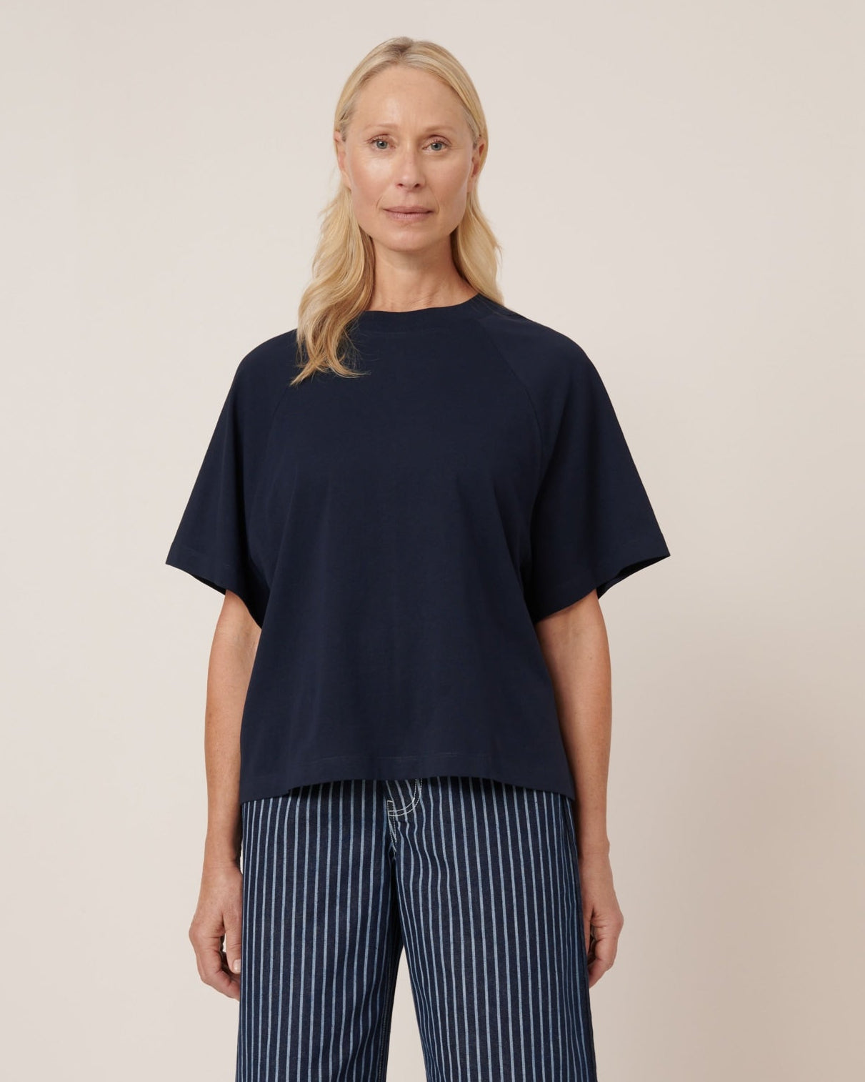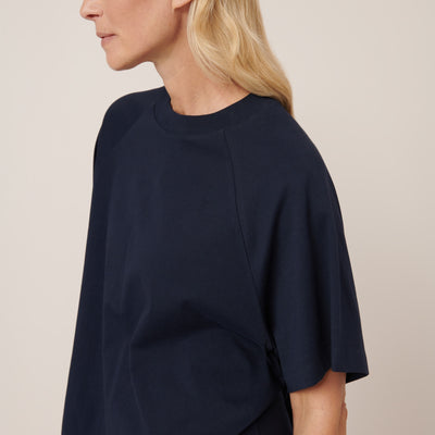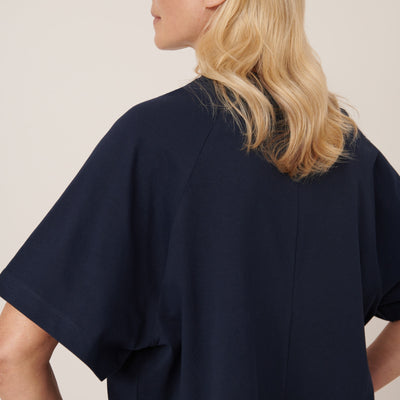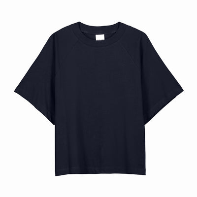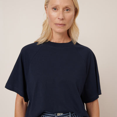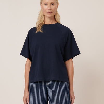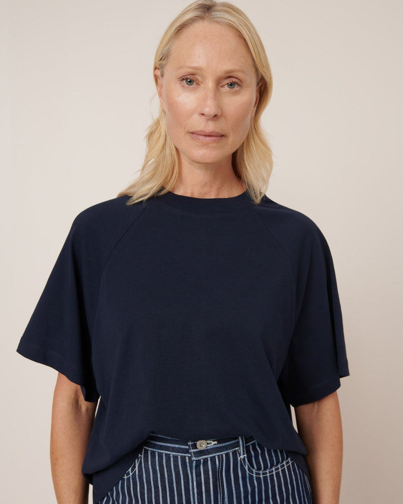 Crafted from soft midweight organic cotton jersey, the Raglan Tee in Navy by Kowtow offers a relaxed boxy fit with oversized raglan sleeves for effortless wear.