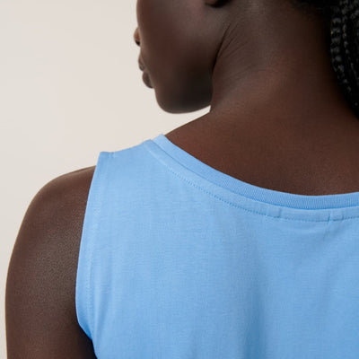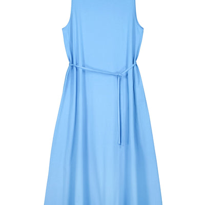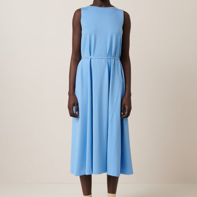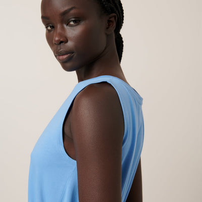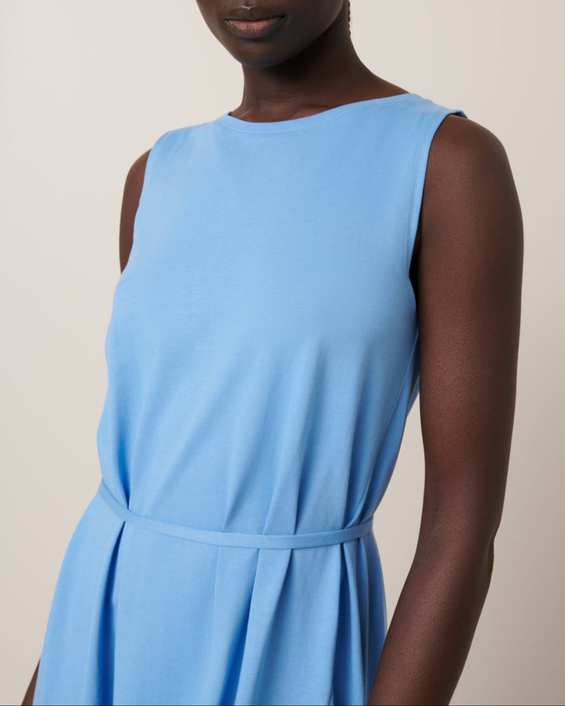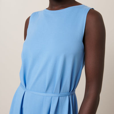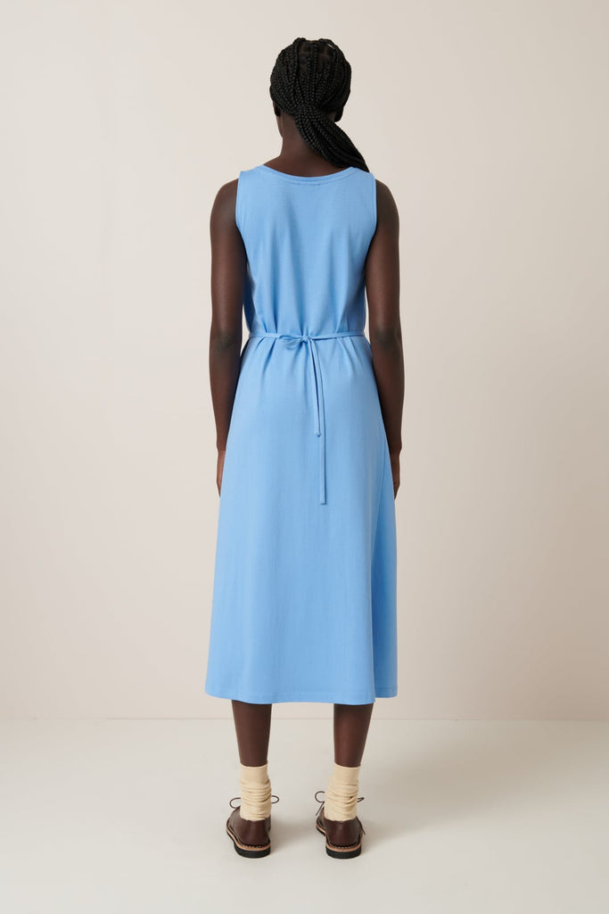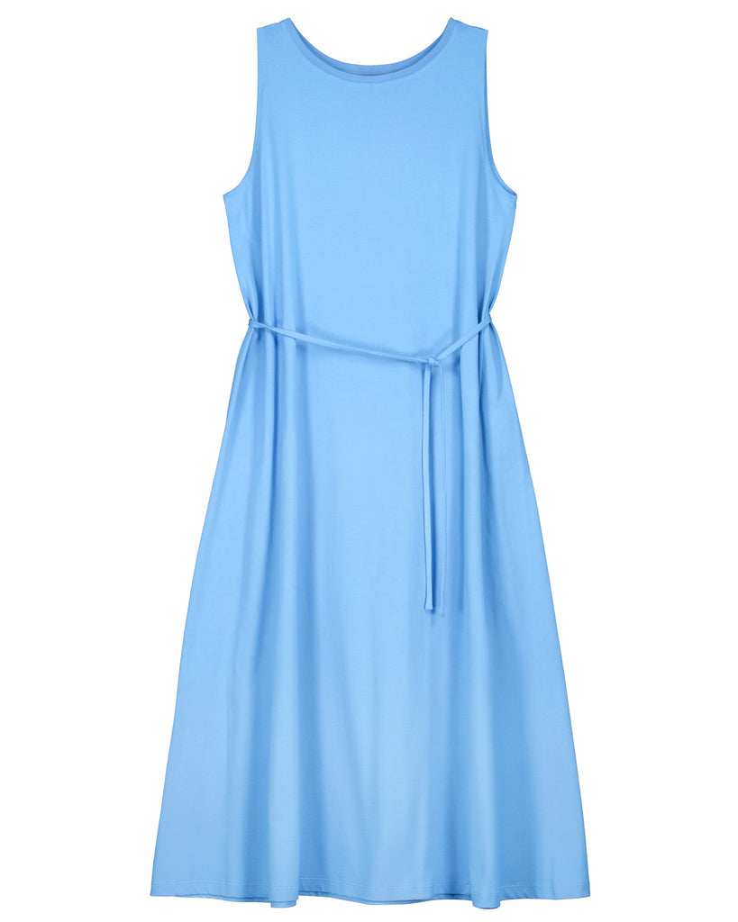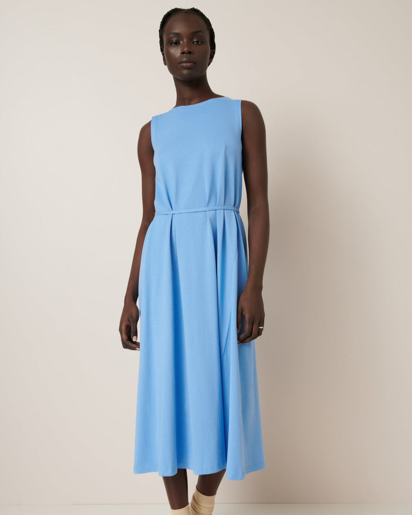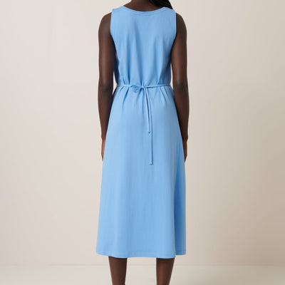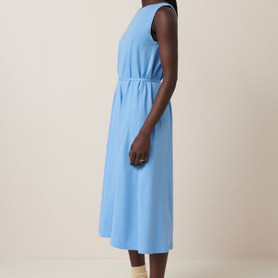 Kowtow's best-selling Tank Swing Dress in Skyline is an easy-wear style designed with an A-line shape for a relaxed, off-the-body fit. It falls mid-shin to ankle length, features Kowtow's signature twisted side seams and it can be worn loose or cinched in at the waist with the narrow fabric tie.
