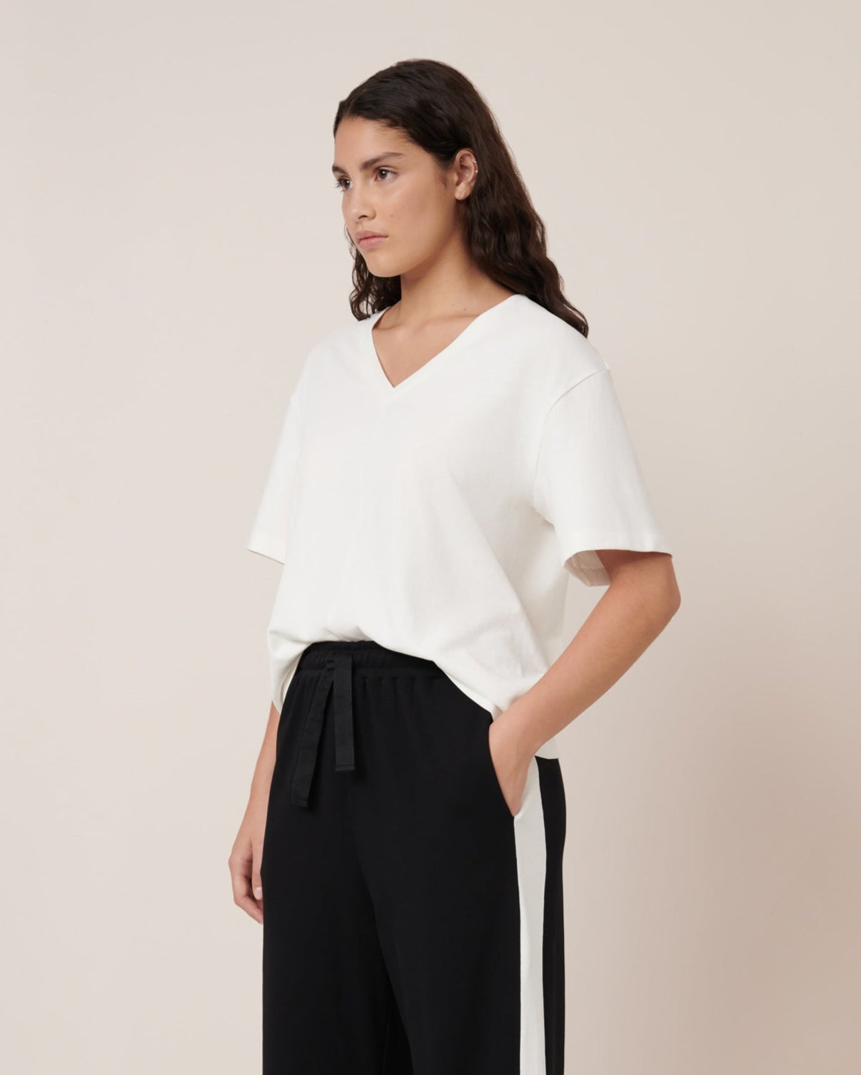 Defined by its effortless drape and flattering V-neckline, the Unity Tee in Off-White by Kowtow offers a relaxed, boxy fit. Featuring drop shoulders and unique centre front and back seams in place of traditional side seams, it is crafted from heavyweight organic cotton jersey.