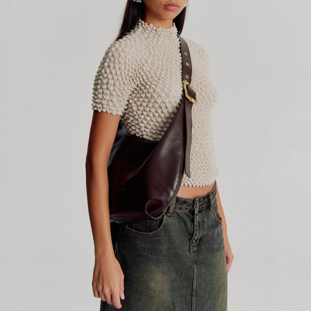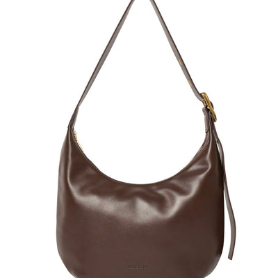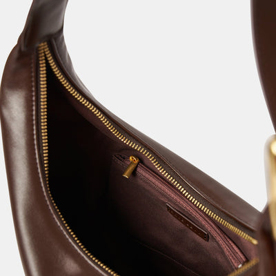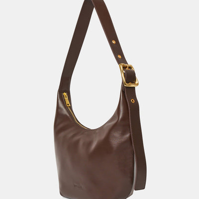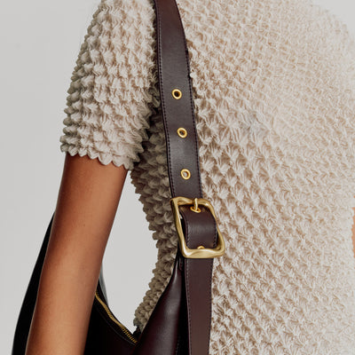 This large version of the most-wanted Everyday Croissant Bag in Chocolate by Brie Leon. Embellished with a brass buckle and multiple eyelets to adjust to the ideal length, its ample size takes you from work to the weekend. Featuring a zip closure and two internal pockets, the Large Croissant has everything you need in a daily bag.