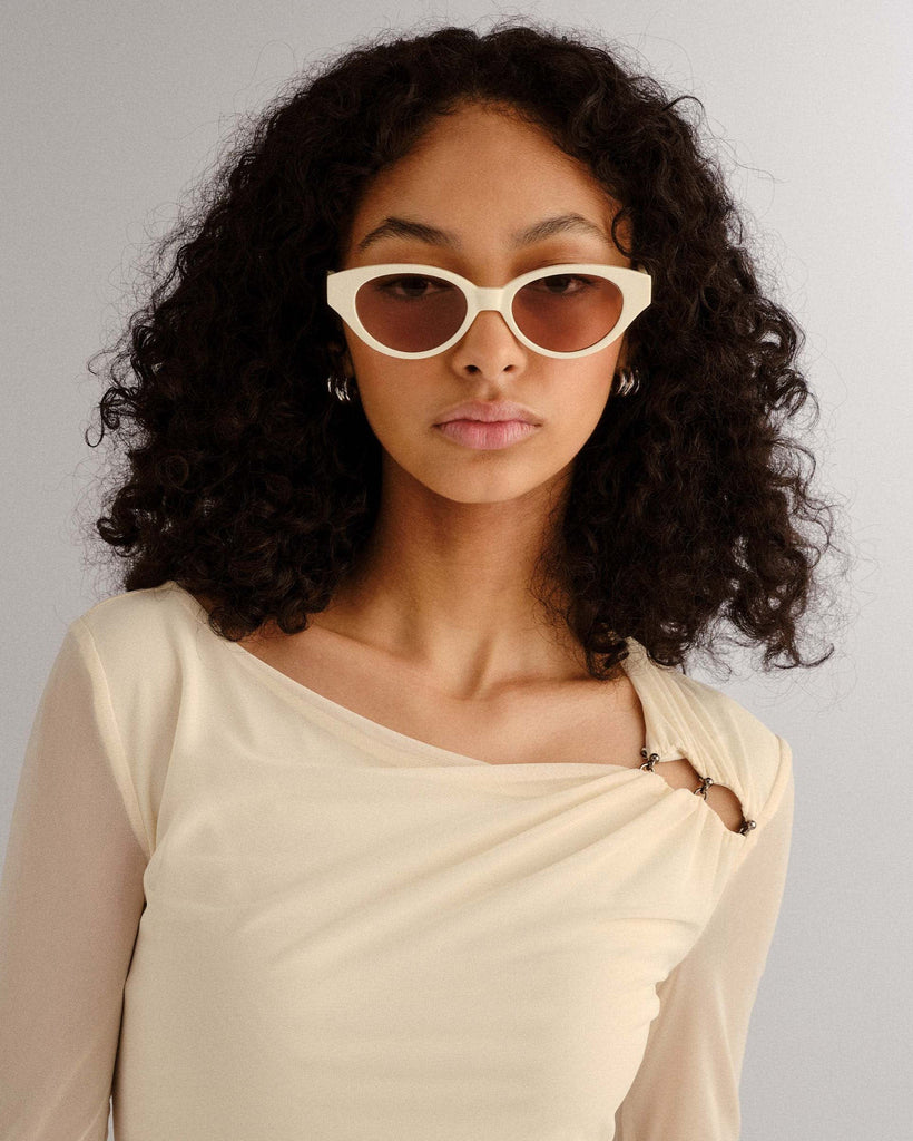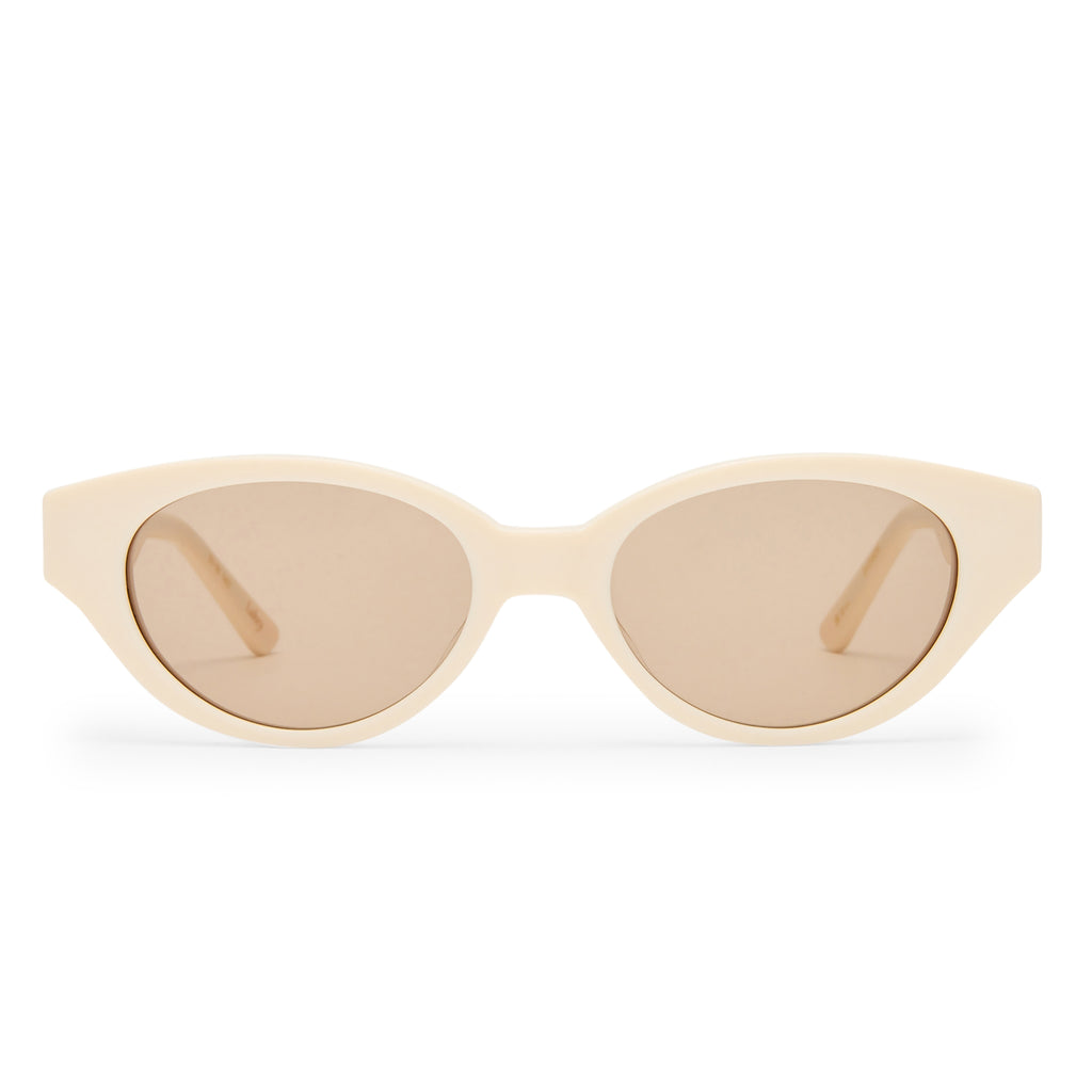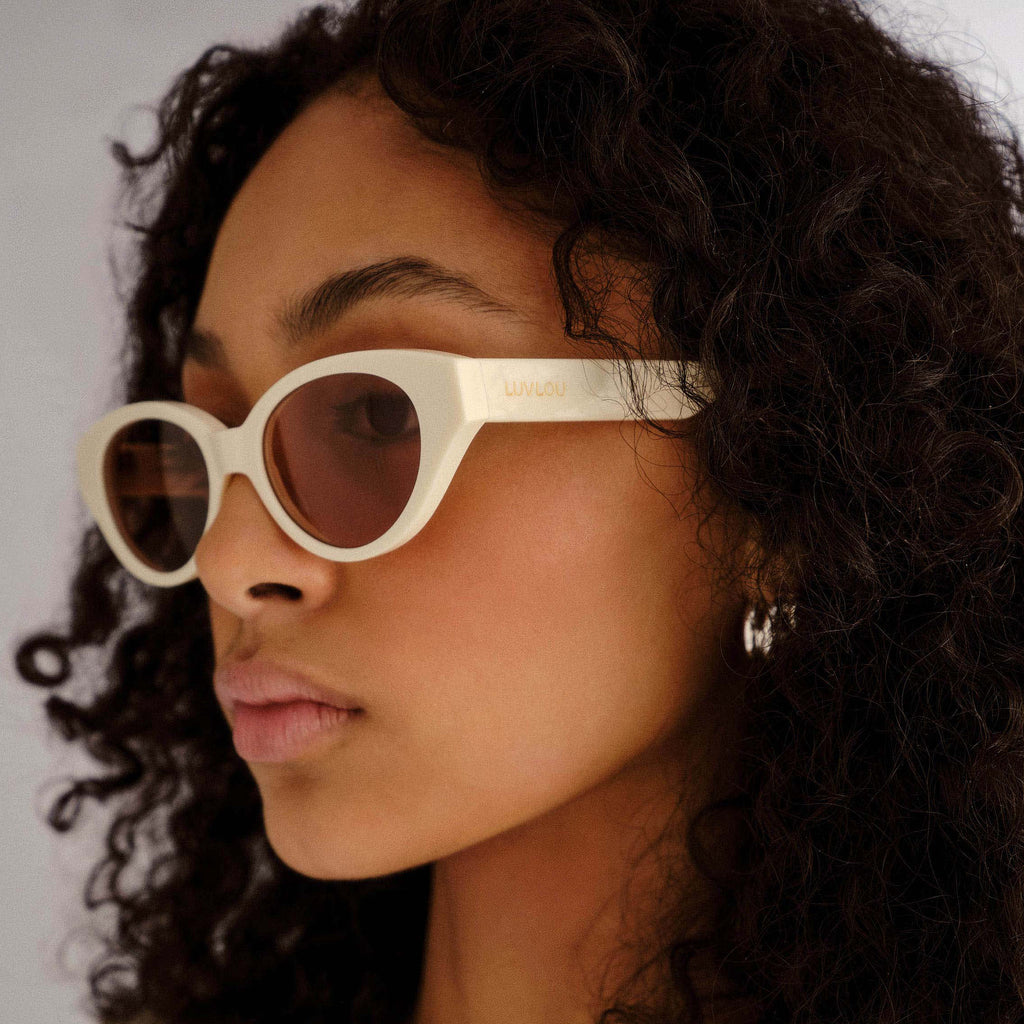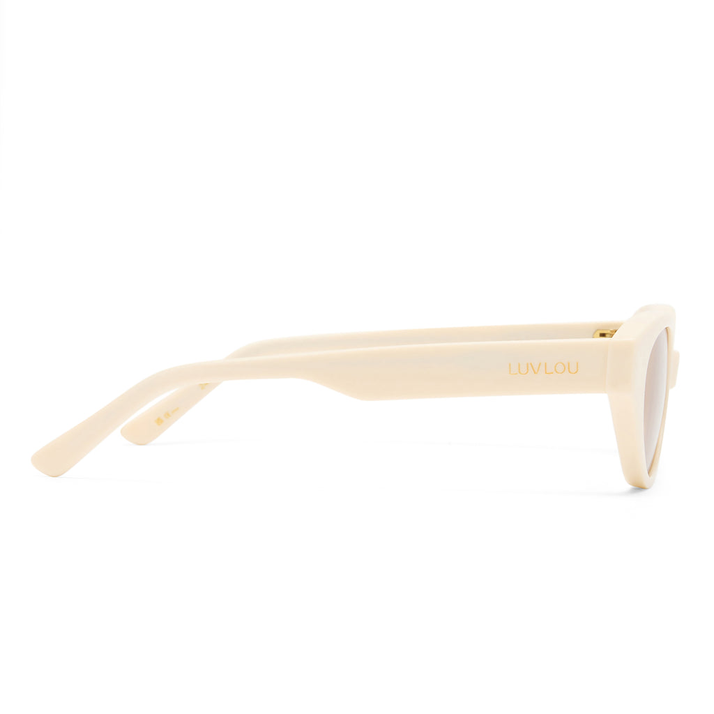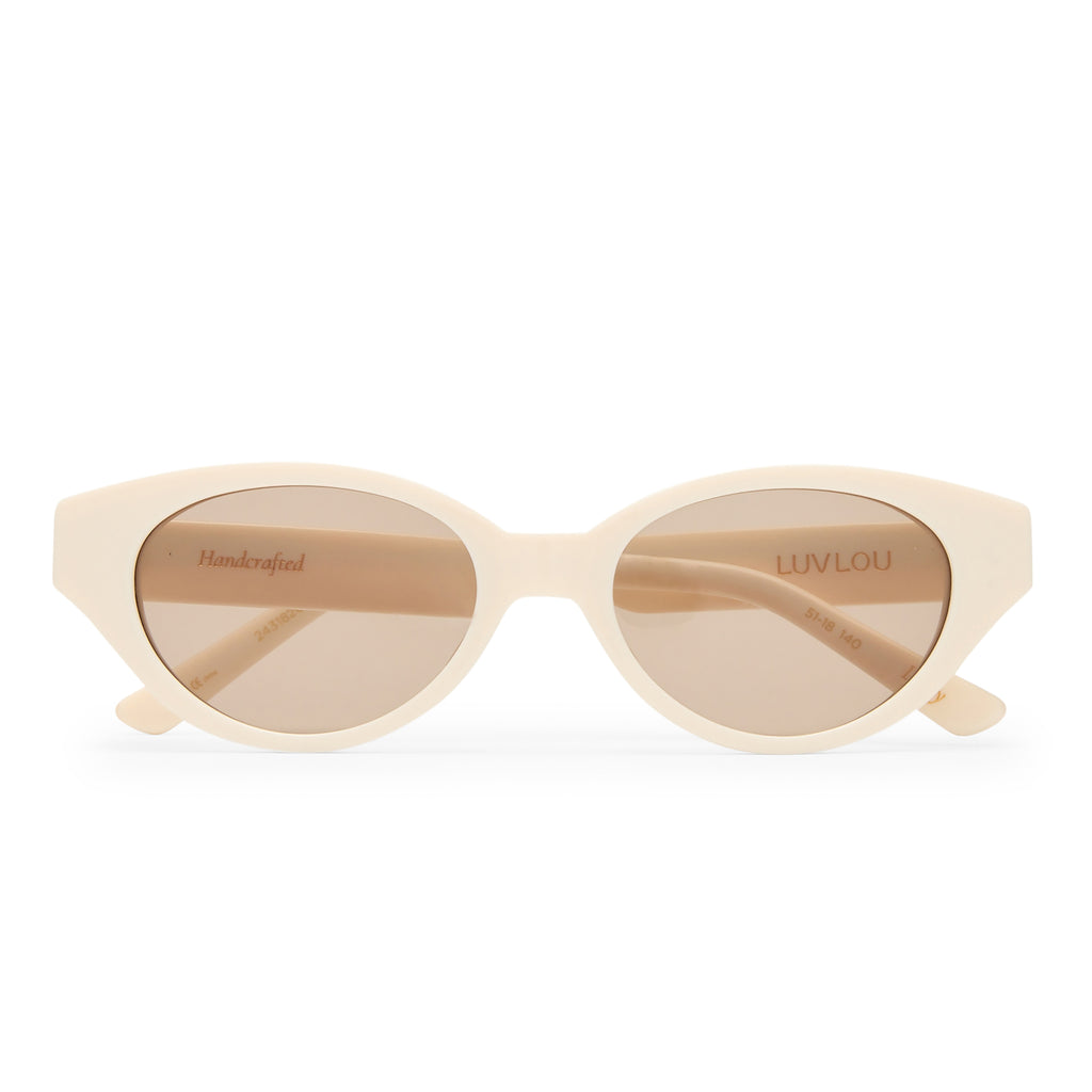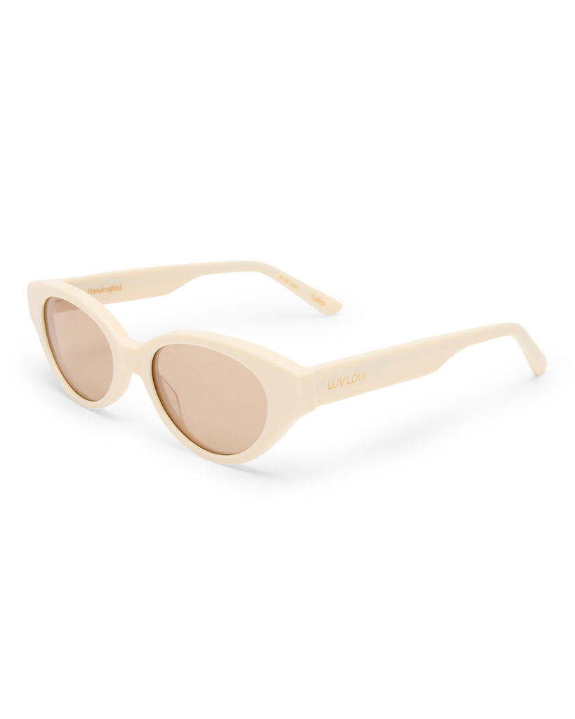 The Lakey Sunglasses in Bone by Luv Lou is a petite cat eye frame that alludes to elegance and femininity in its design. Handcrafted with premium bone acetate and paired with a light brown tint lens. This style features Luv Lou's luxe gold foil logo on the outer temple adding to its quiet luxury.