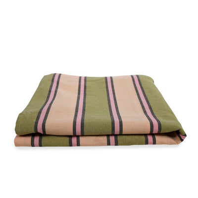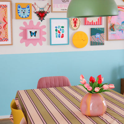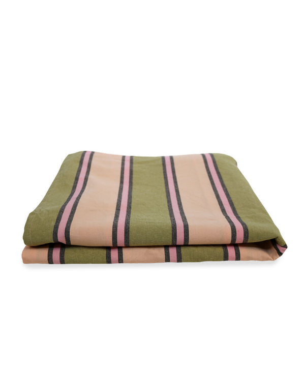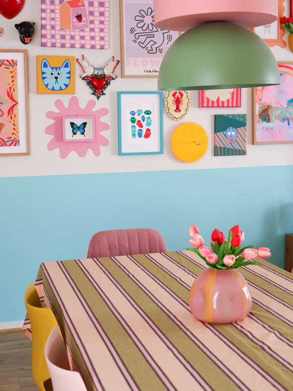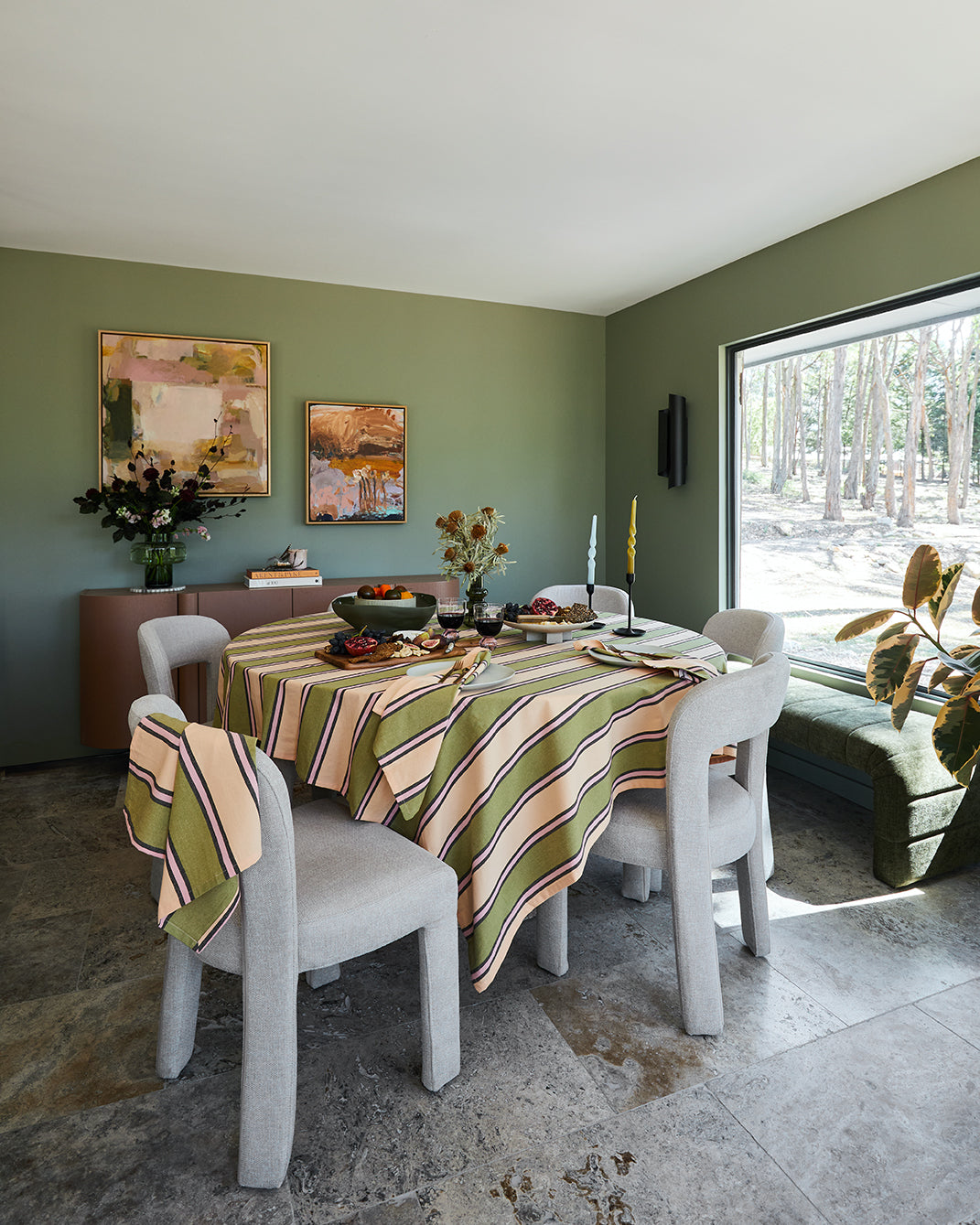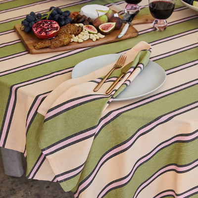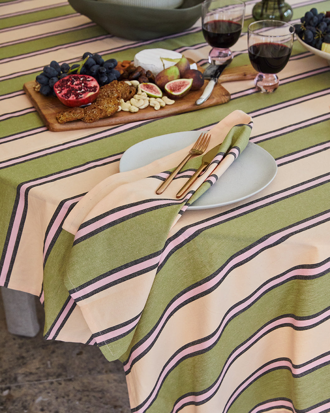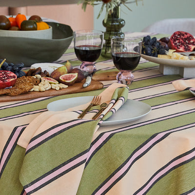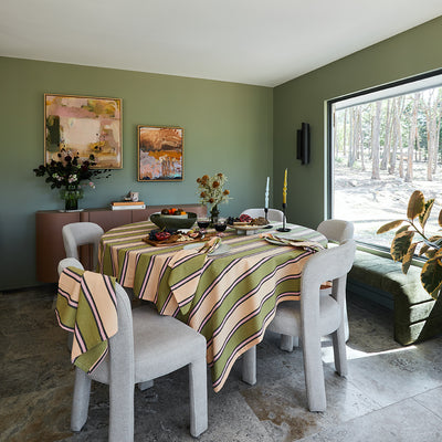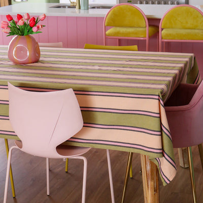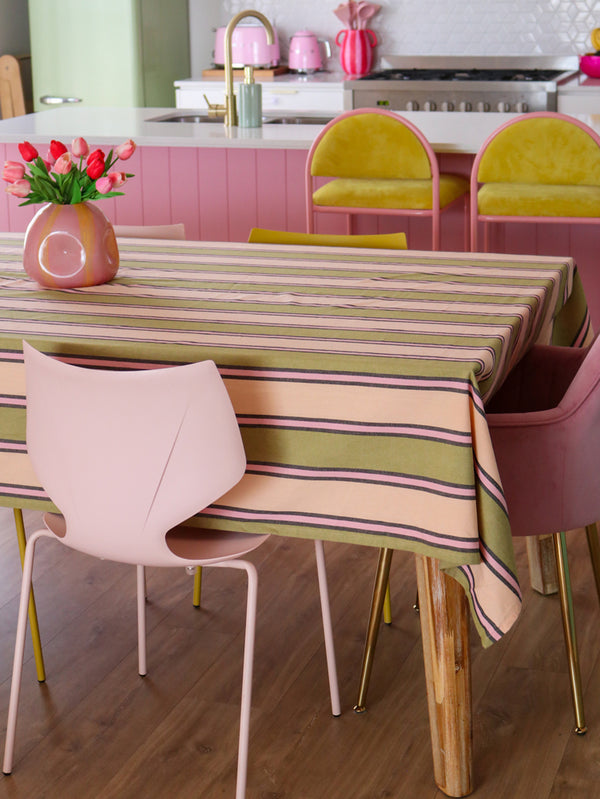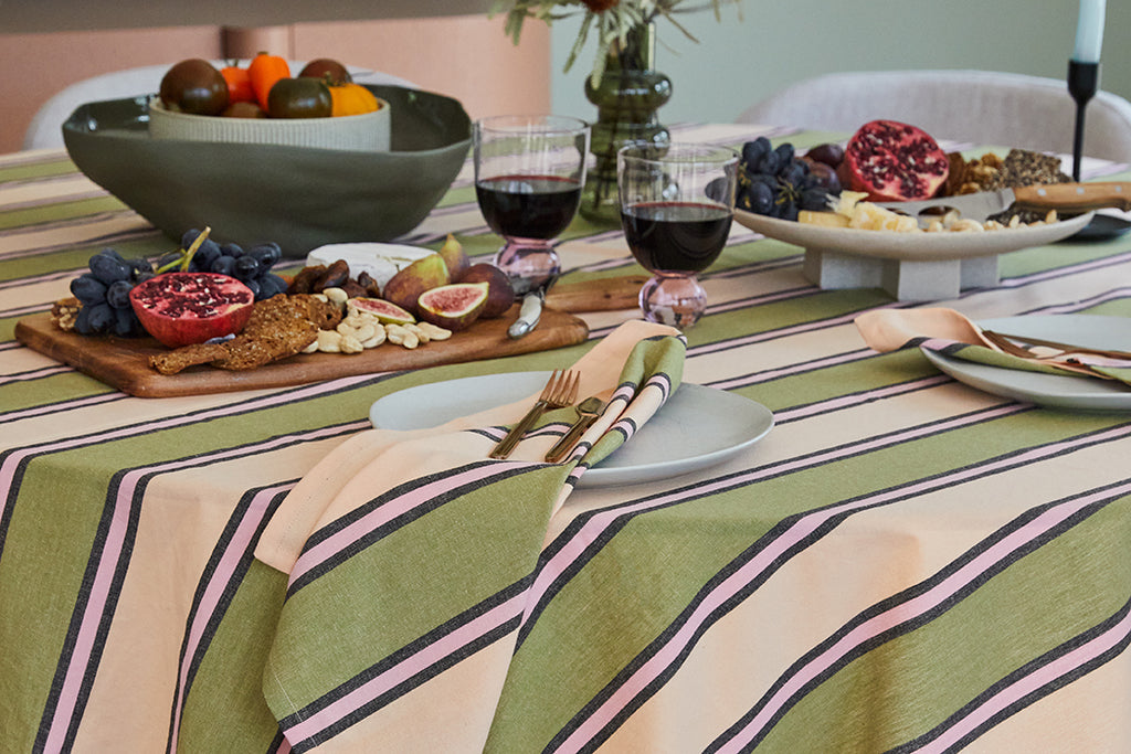 No matter the occasion, the Carnival Stripe Tablecloth by Mosey Me is the perfect backdrop for every meal. The wide stripes in pistachio, salmon and pastel pink tones create a print that feels both contemporary and joyful, a great modern dining touch.