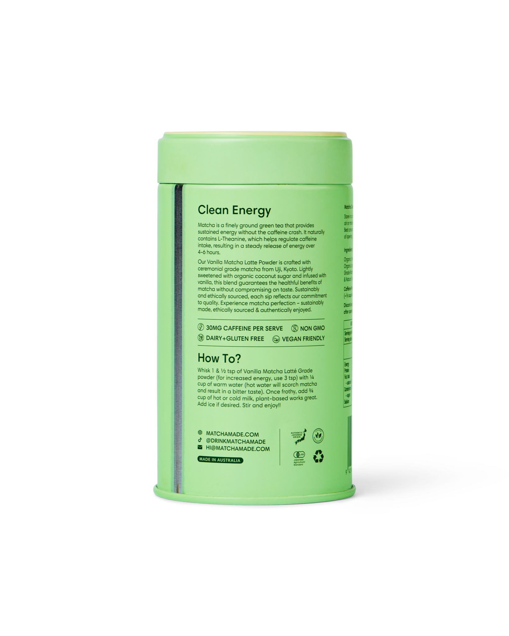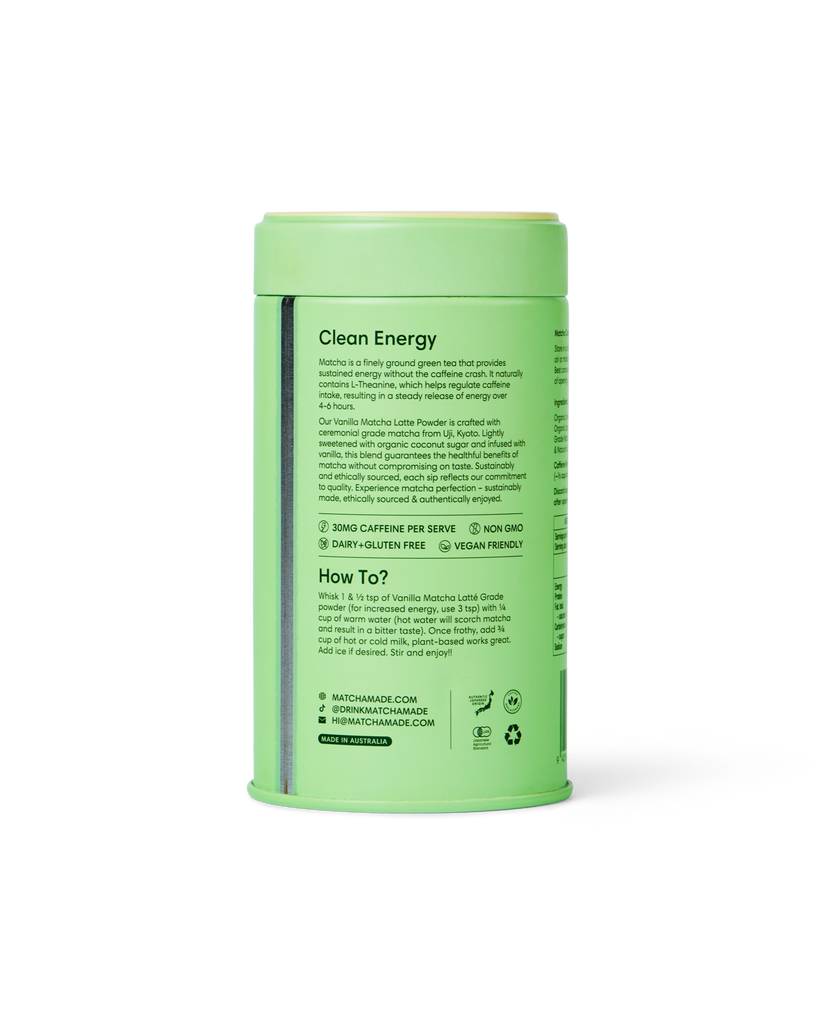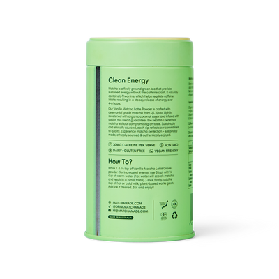 The Vanilla Matcha Latte by Morning Made is a low-sugar coffee alternative for energy and focus. Get a smooth, sustained energy boost without jitters or crashes. Morning Made matcha is grown in Uki, Japan and is packed with L-Theanine for focus, antioxidants for wellness, and a naturally sweet, creamy taste. Whether you're replacing coffee or upgrading your routine, this matcha is your go-to for calm, balanced energy.