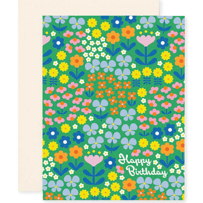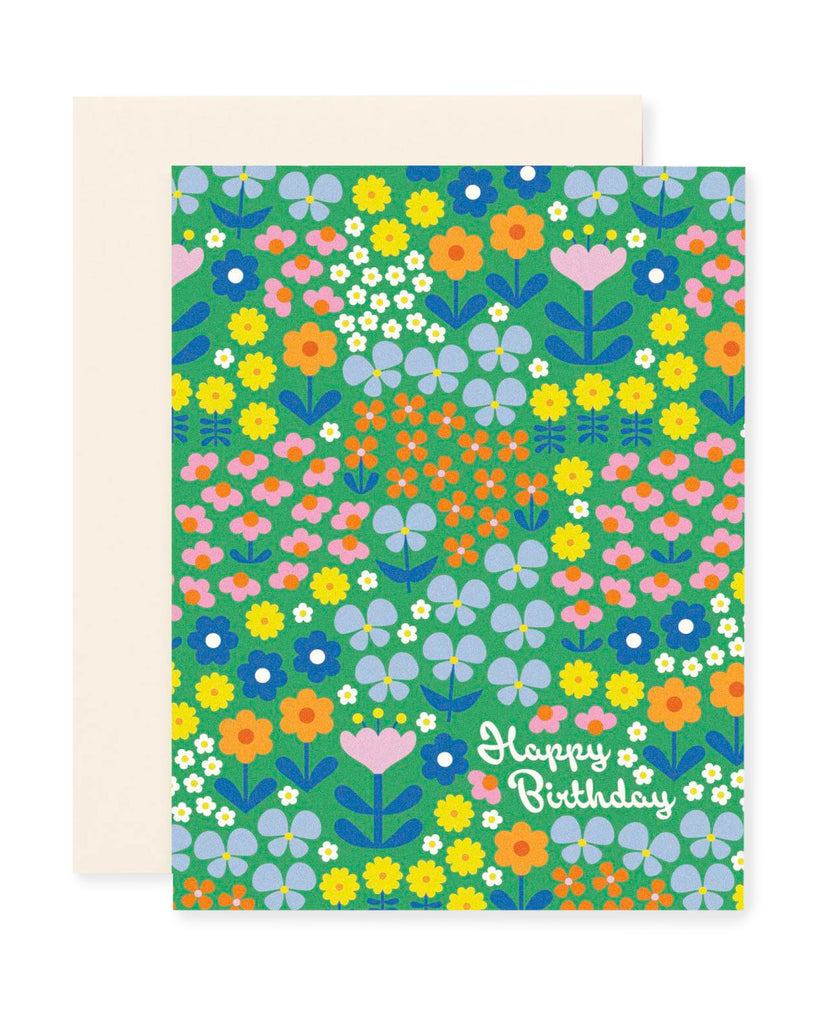 A colourful birthday card with a meadow of cheerful blooming flowers, perfect to celebrate someone special.