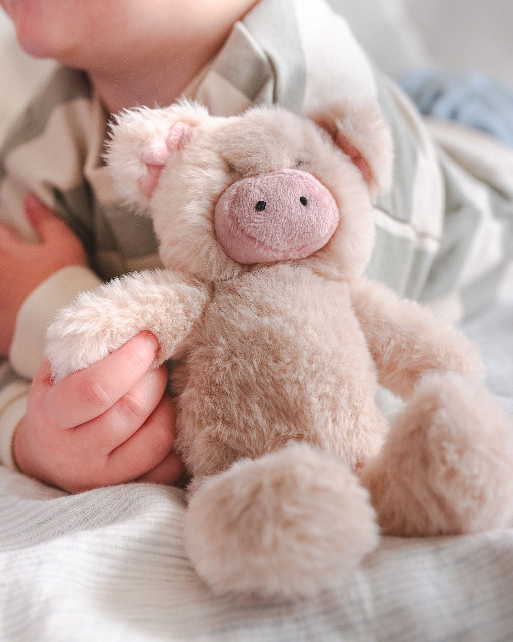 Poppy Pig Rattle by Nana Huchy loves staying home, cuddling into the arms of a loving child.
