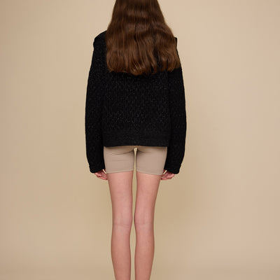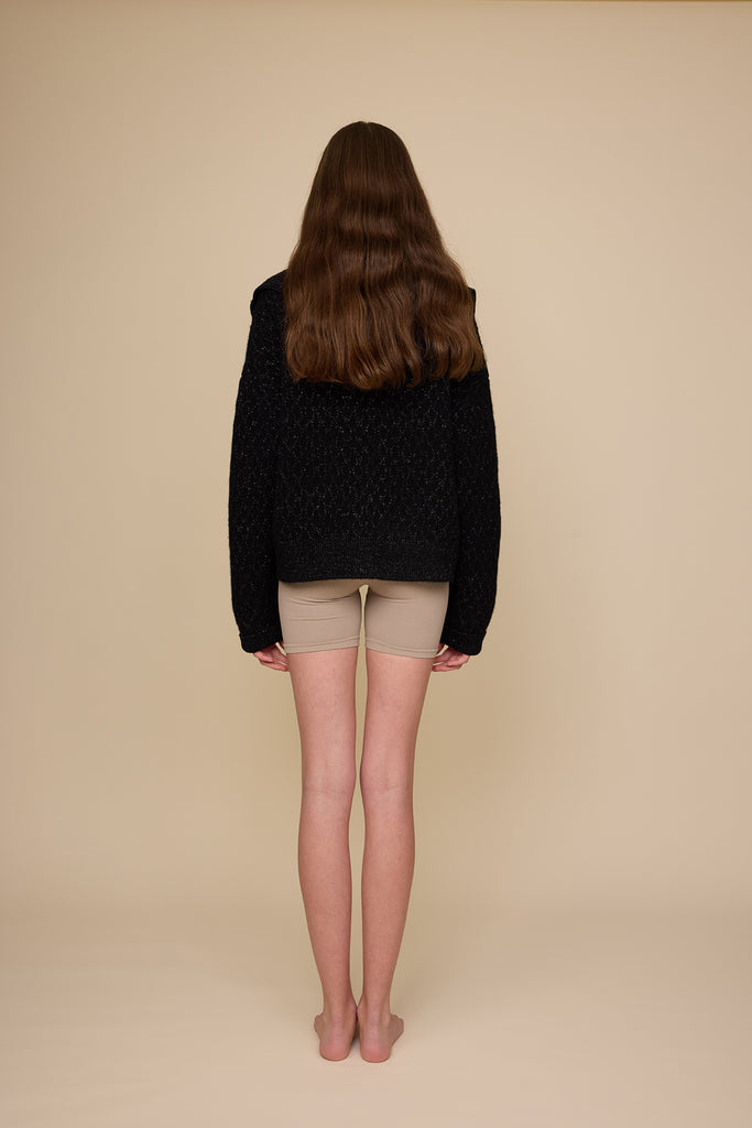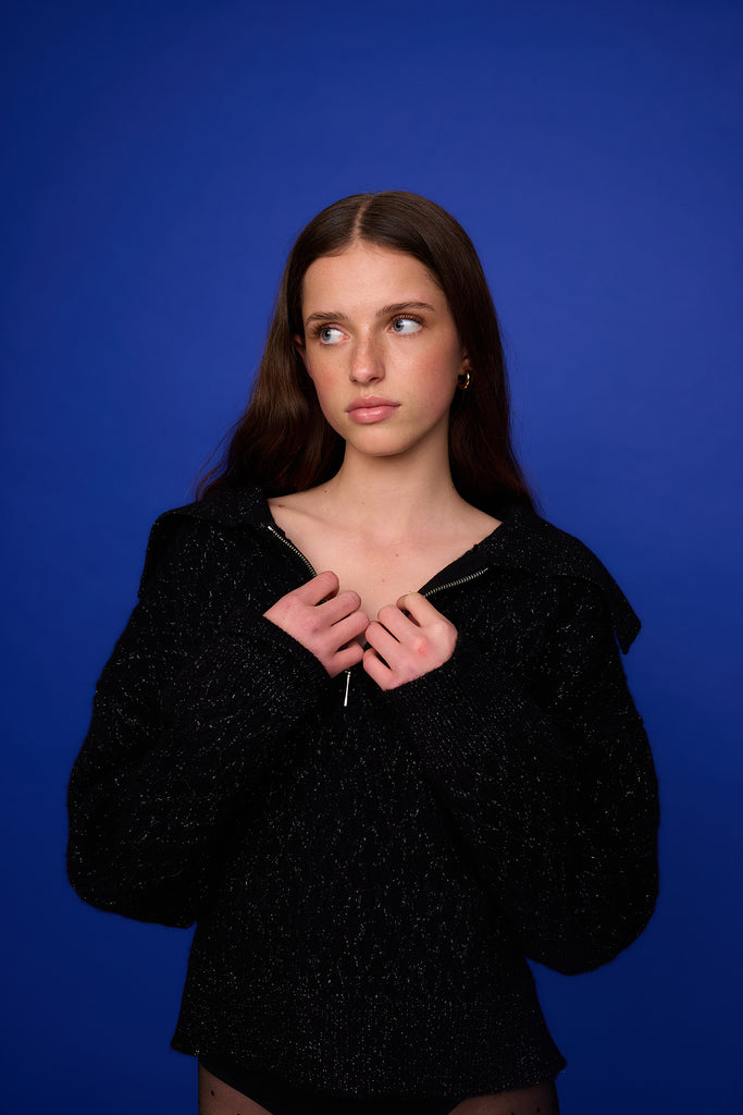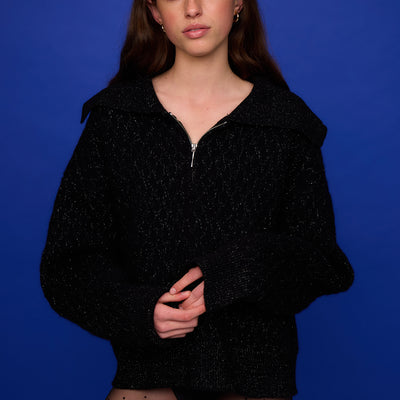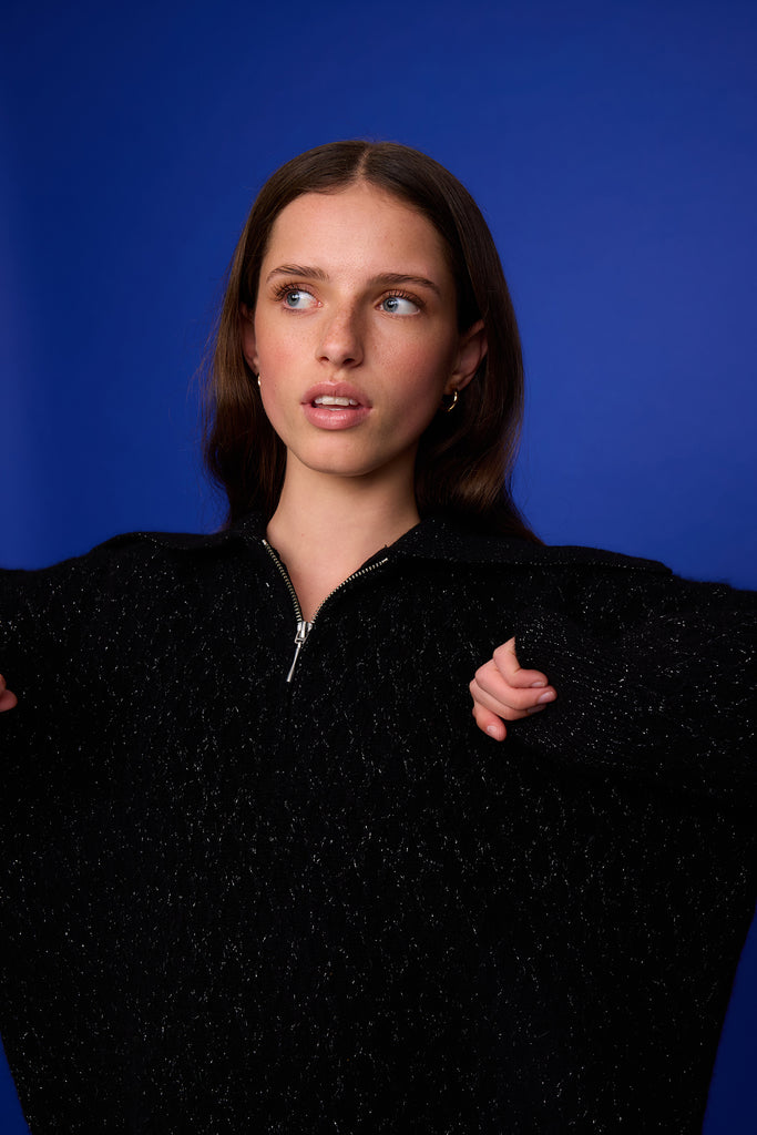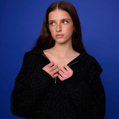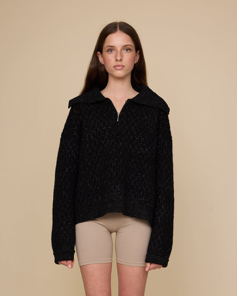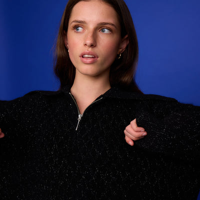The Ola Zip Crew in Black Sparkle by Phàrlain is crafted in merino yarn with a sparkle lurex yarn throughout. Relaxed in fit, the Ola Crew features a honeycomb knit design with a 3/4 zip front and fold-down rib collar.