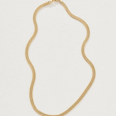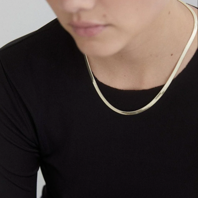 Taking inspiration from the luxurious extravagance of the eighties, the Halley Necklace in Gold by Reliquia is a wide snake chain creating a slinky, minimalistic look.