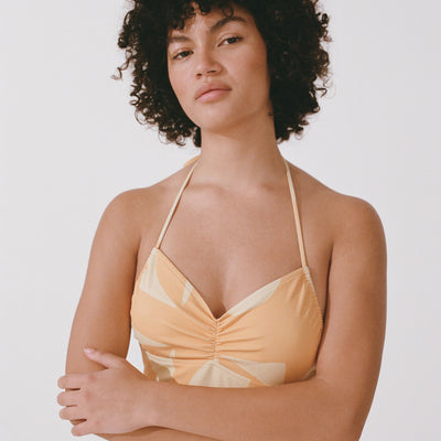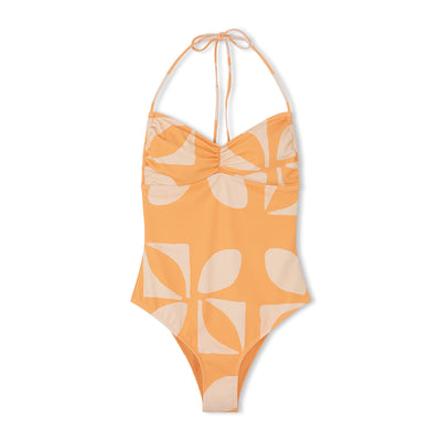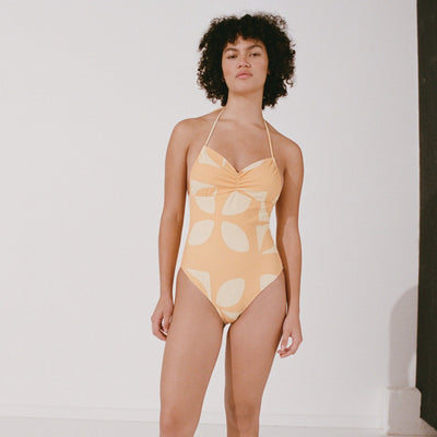 The Retro Sun Tile Halter One Piece by Zulu & Zephyr features a comfortable soft bust with an adjustable halter neck tie, a scoop back and bust ruching that may be gathered at the side to suit, and the bottom offers moderate coverage.