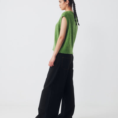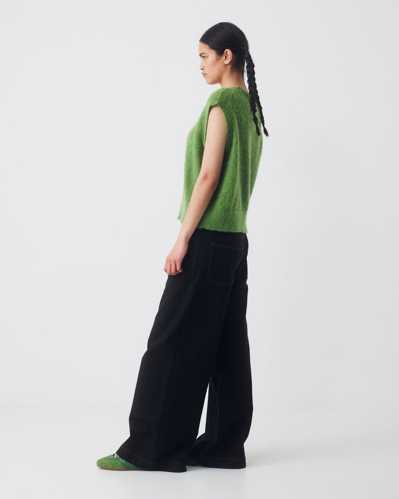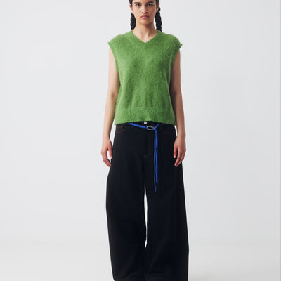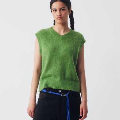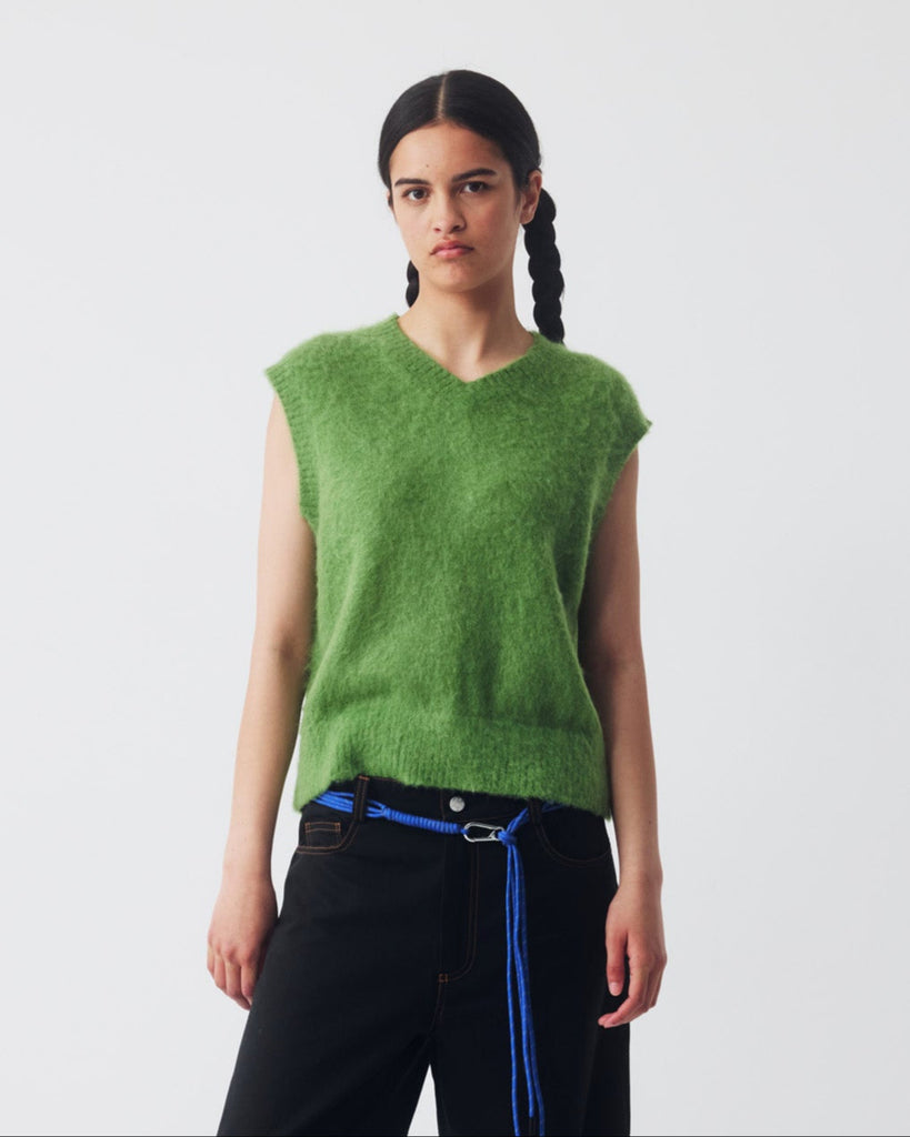 Stay warm and stylish with the Aya Vest in Grass Green by Ricochet. Made from a luxurious brushed mohair and merino blend, this vest is the perfect addition to your winter wardrobe. With its soft and cozy texture, it's sure to keep you comfortable and fashionable all season long.