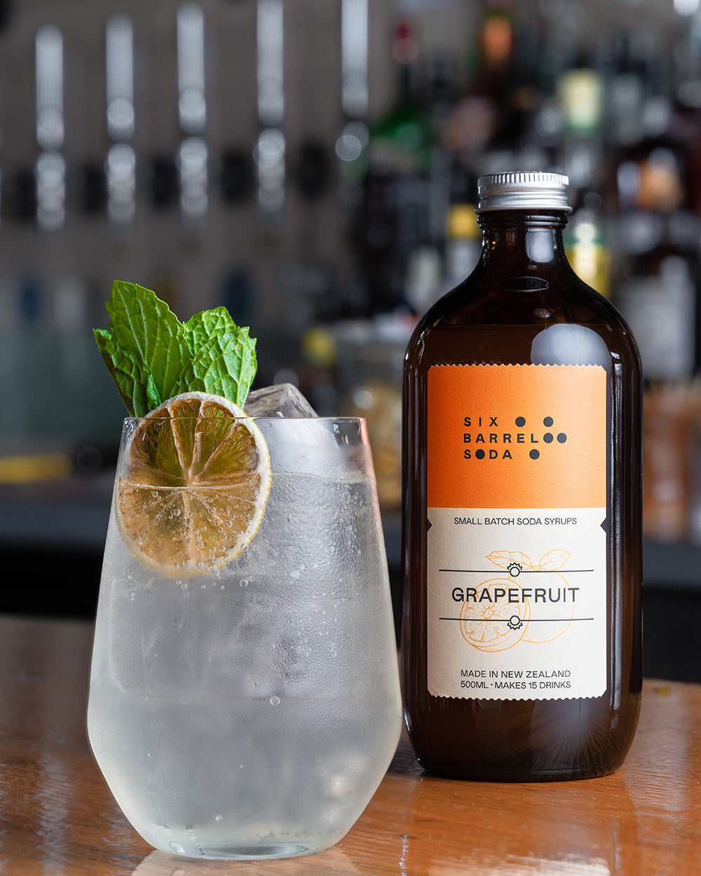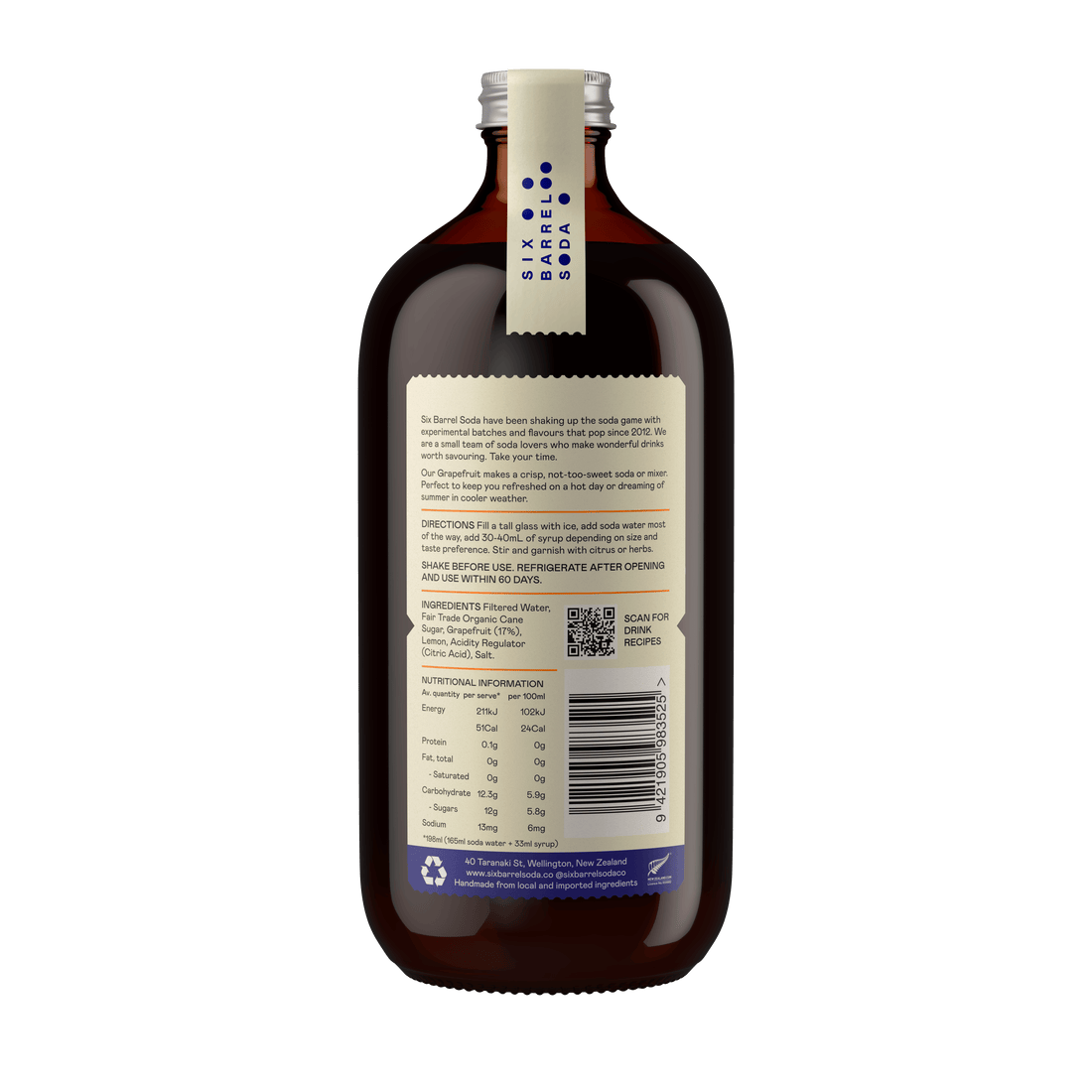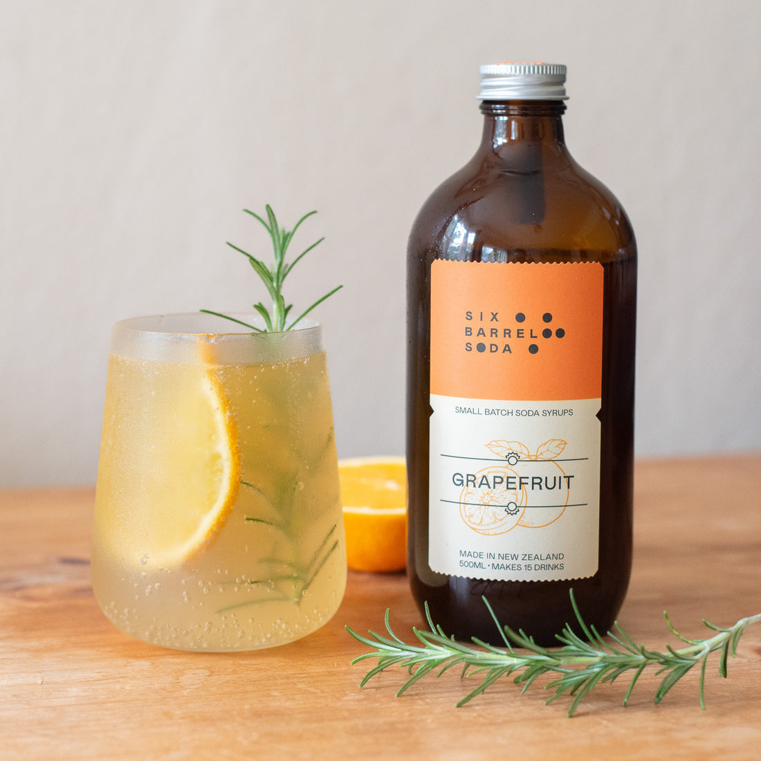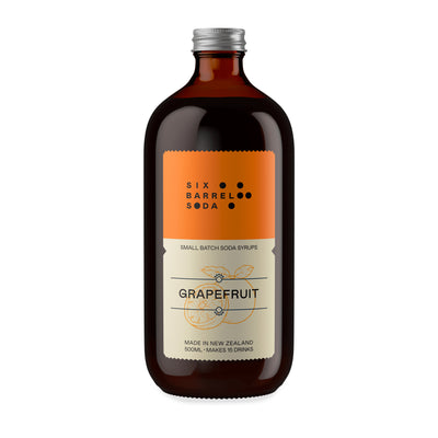 Six Barrel's Grapefruit Soda Syrup makes a crisp, not-too-sweet soda or mixer. Perfect for keeping you refreshed on a hot day or dreaming of summer in the cooler weather.