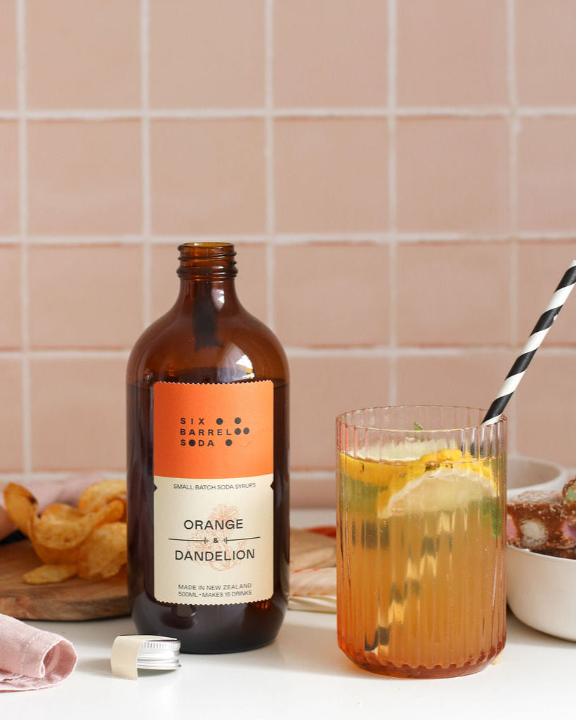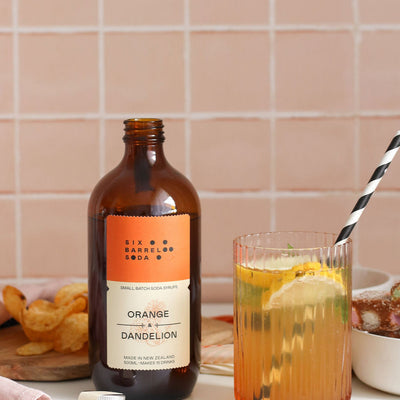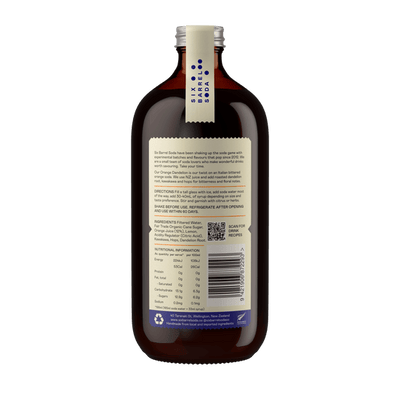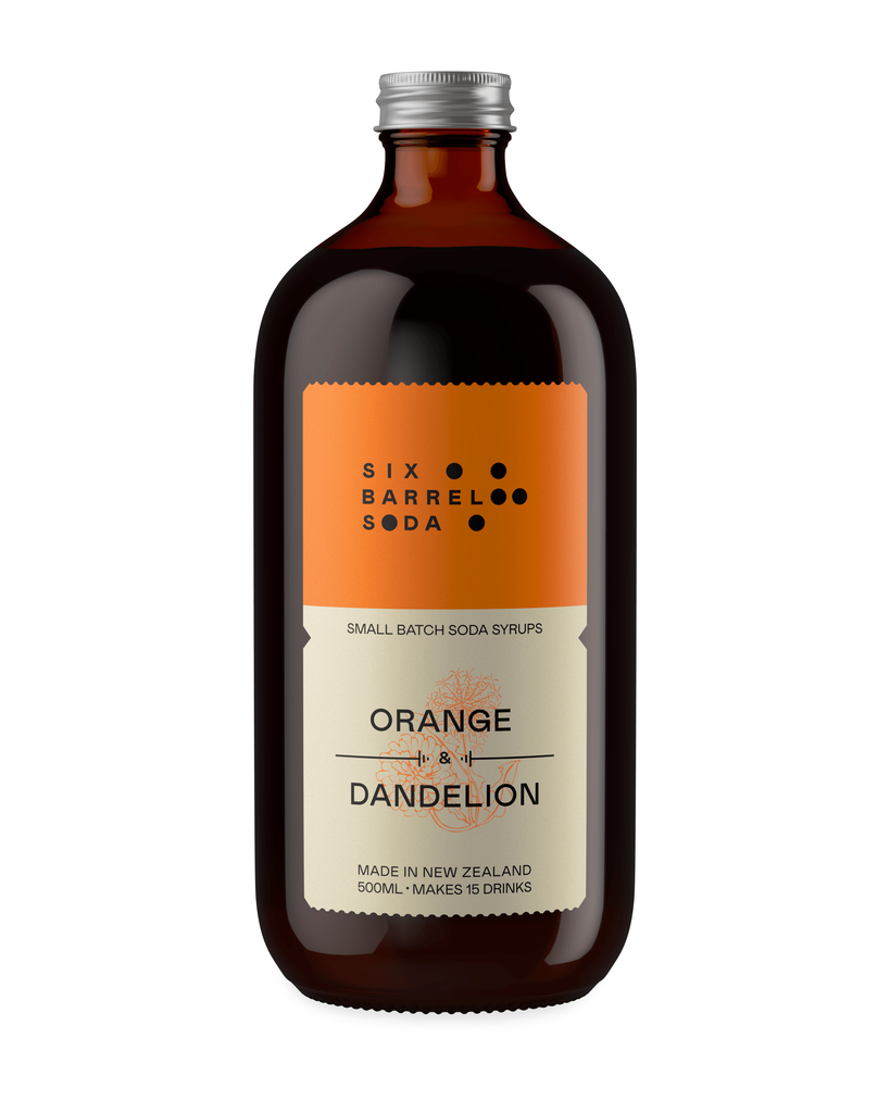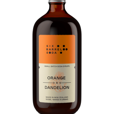 This Orange & Dandelion Soda Syrup is Six Barrel's twist on an Italian bittered orange soda. It uses real juices for a crisp citrus backbone and adds roasted dandelion root, kawakawa and hops for bitterness and floral notes. It can even be used as a non-alcoholic Aperol spritz.