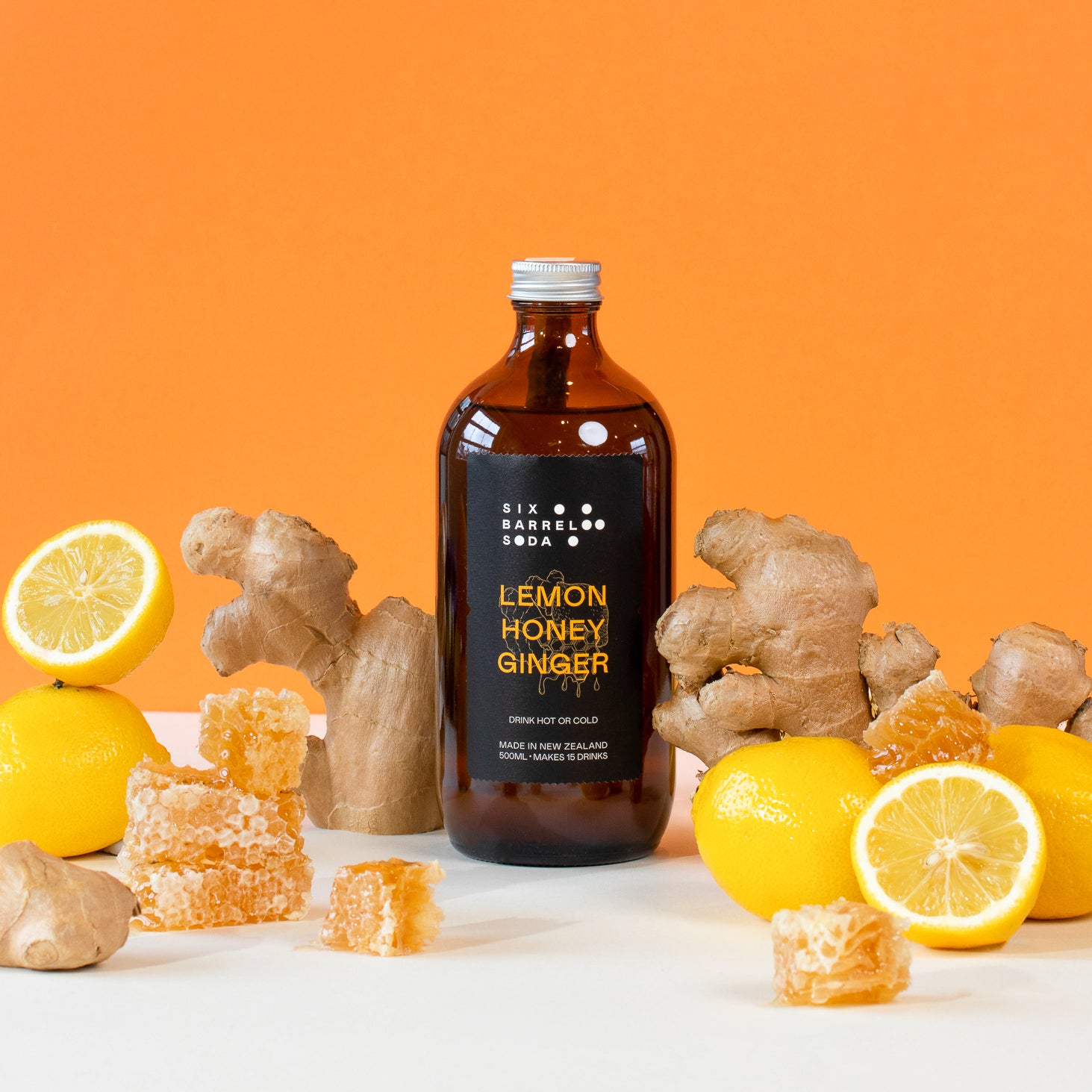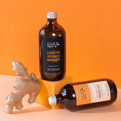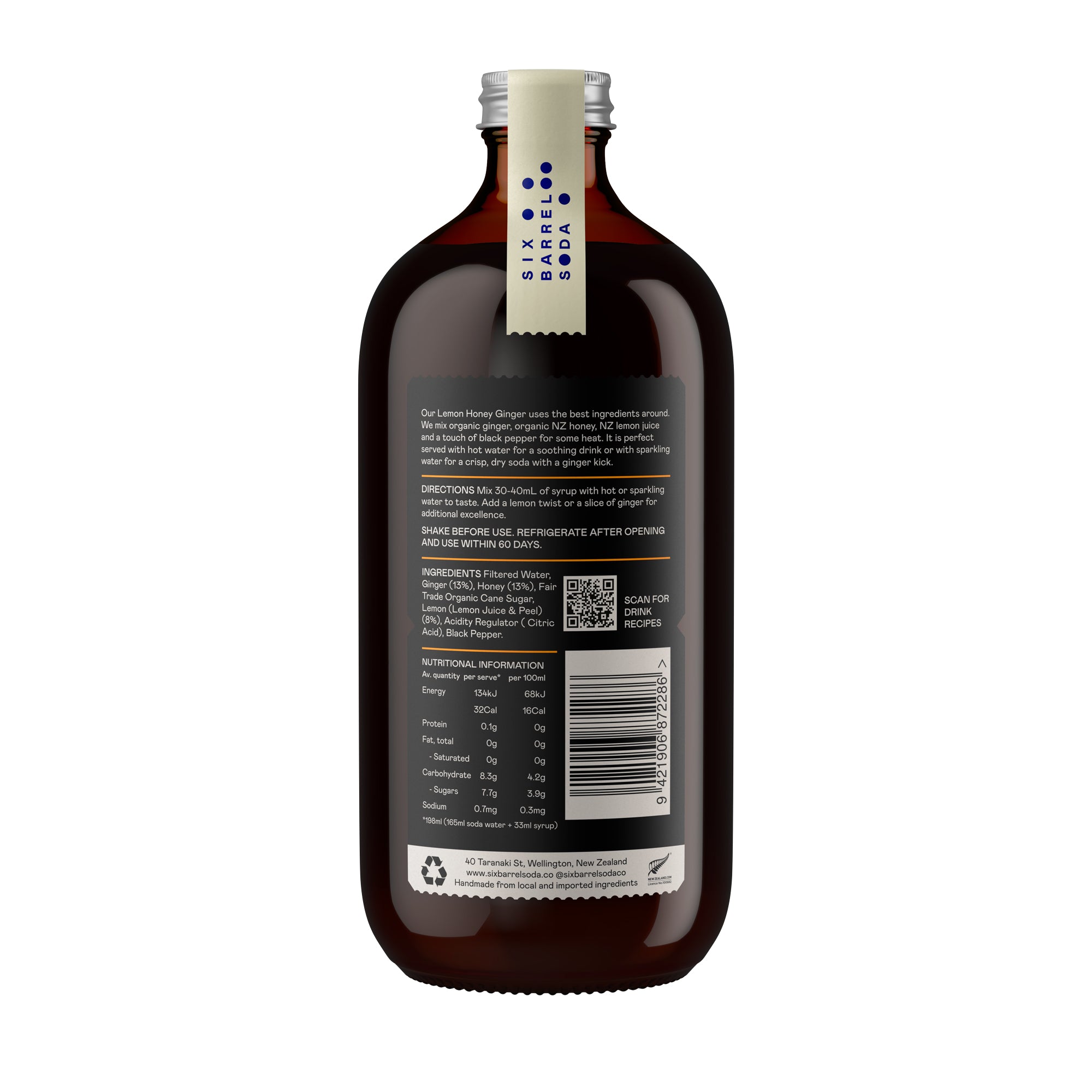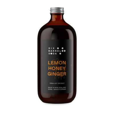 Six Barrel's Lemon Honey Ginger Syrup uses the best ingredients around. Six Barrel mix organic ginger, organic NZ honey, NZ lemon juice and a touch of black pepper for some heat. It is perfect served with hot water for a soothing drink or with sparkling water for a crisp, dry soda with a ginger kick.