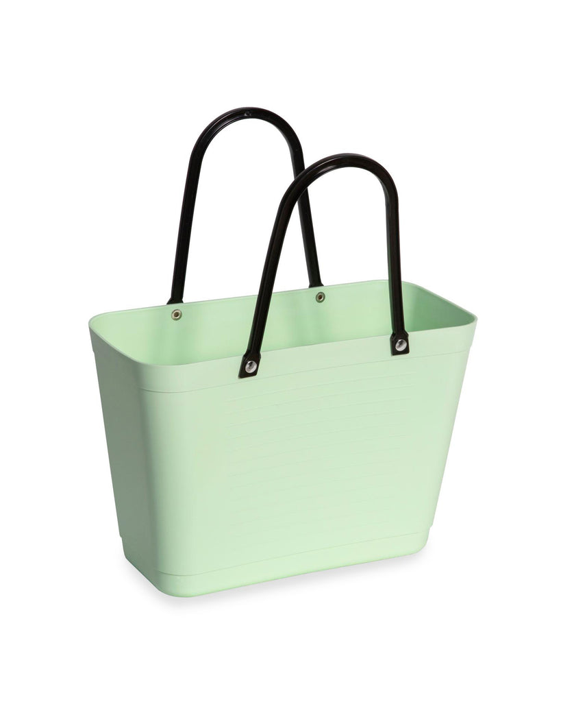 Small Eco-Friendly reusable bucket bag in light Green by Scandinavian-based brand, Hinza. All Hinza bags are long-lasting, durable and recyclable, thus saving additional natural resources and minimising any environmental impact. This Green Plastic version of the Hinza bag is even more eco-friendly as the plastic is made from sugar cane, a renewable raw material.