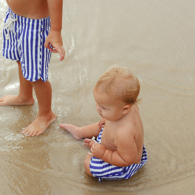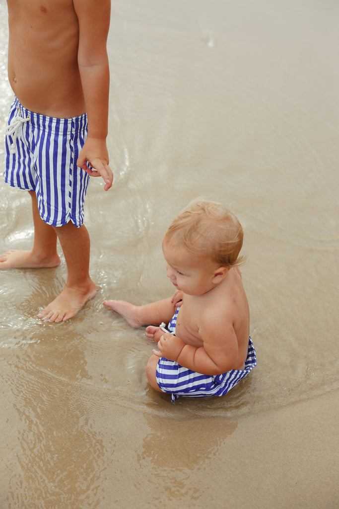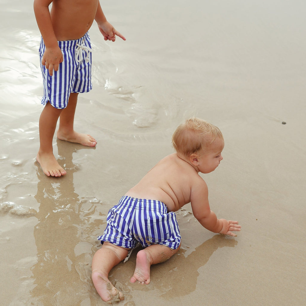These Stripe Boardshorts in Blue by Sonny Label are your mini's ultimate beach & pool companion. Featuring a simple stripe, lining, and an elasticated waistband with a drawstring ensuring a perfect fit.
