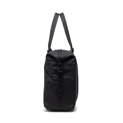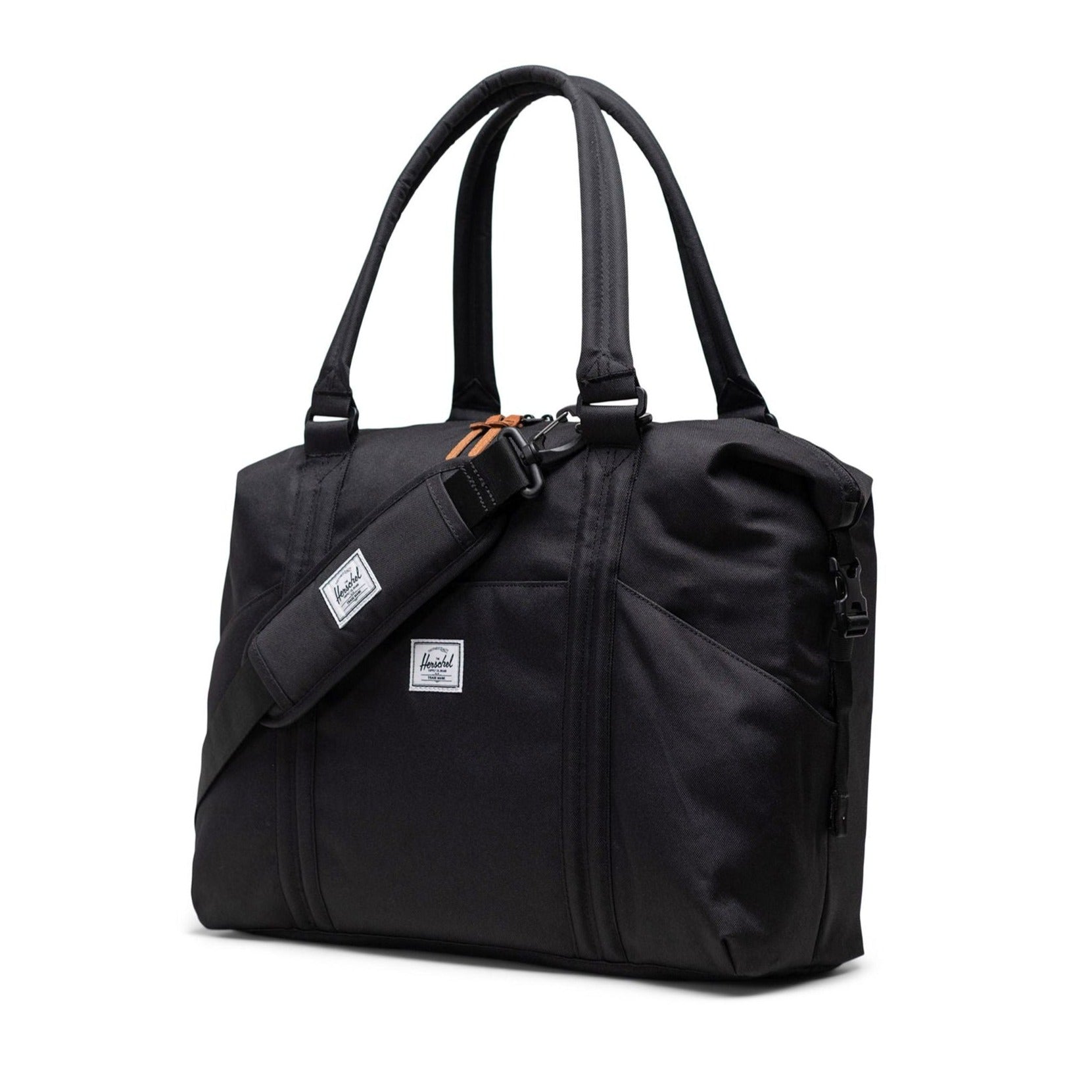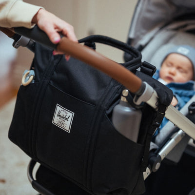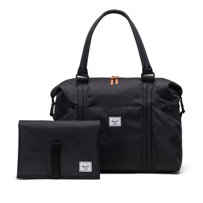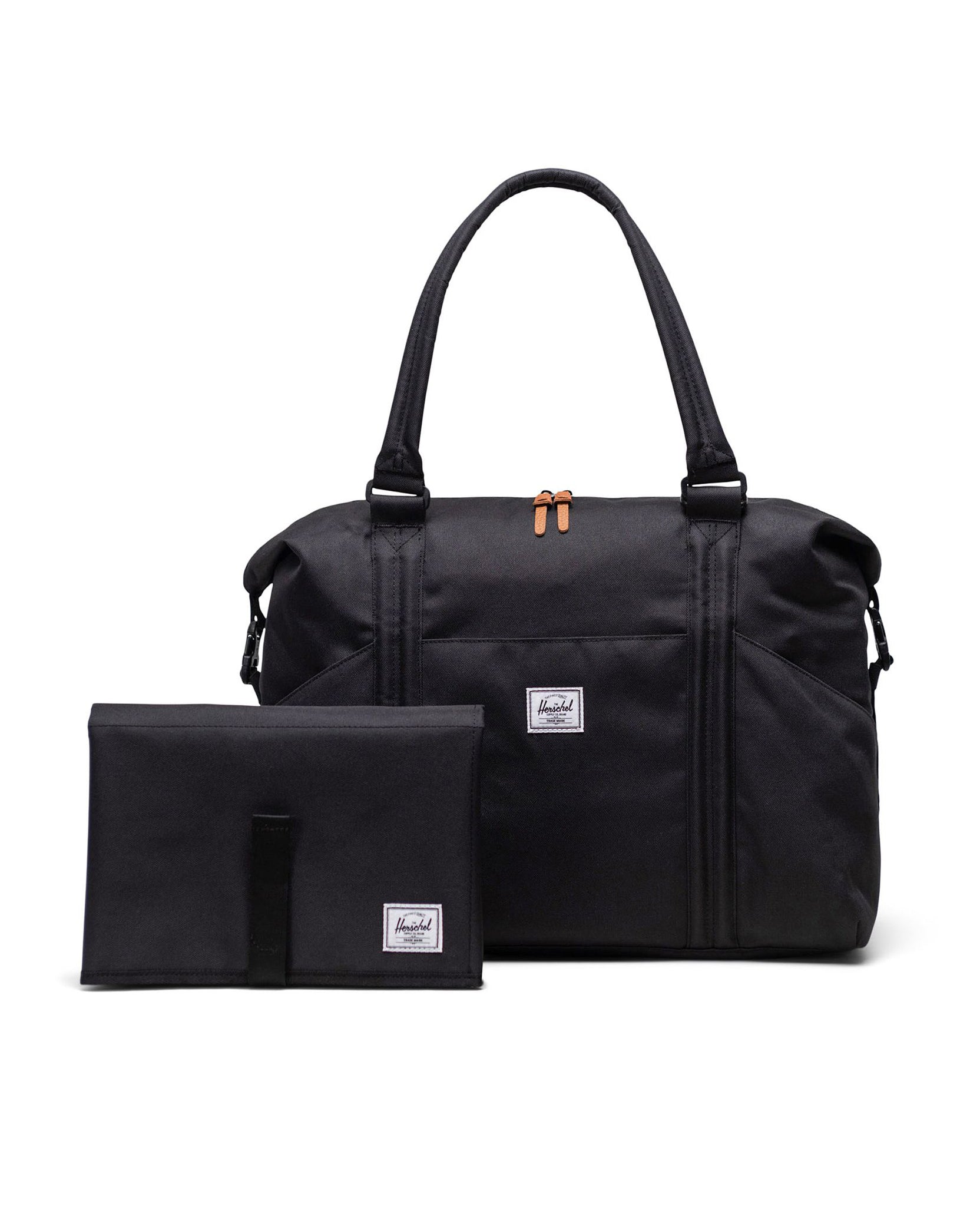 The Strand Duffle Nappy Bag in Black by Vancouver-based Herschel. Hung from the stroller or thrown over a shoulder, this daily duffle handles all the essential baby equipment - and yours, too. Smart organisation and the packable changing mat make this a must for new parents.