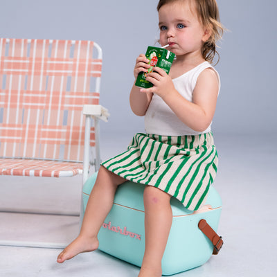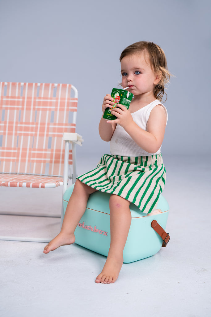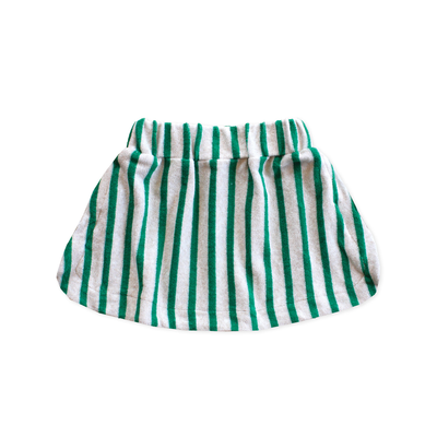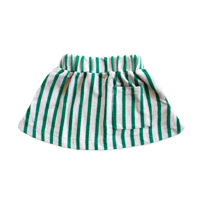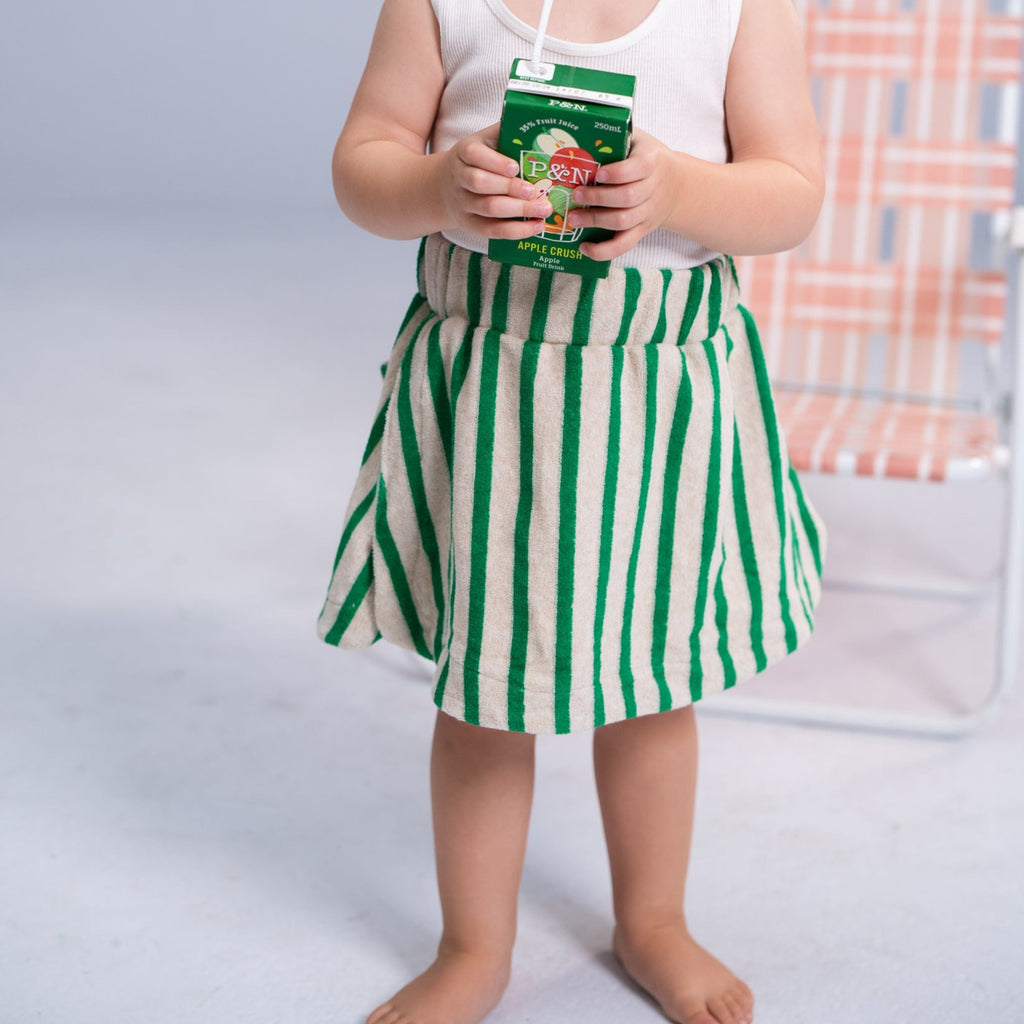The Terry Skirt in Pickle Stripe by Sonny Label is an easy pull-on, elastic waist skirt in soft towelling, featuring a curved side hem and cute back pocket. Perfect for popping on over your togs after a swim.