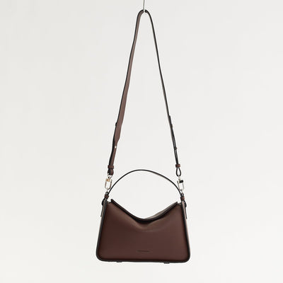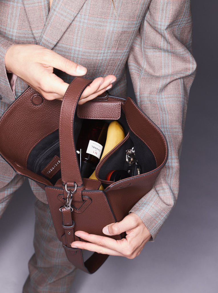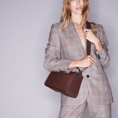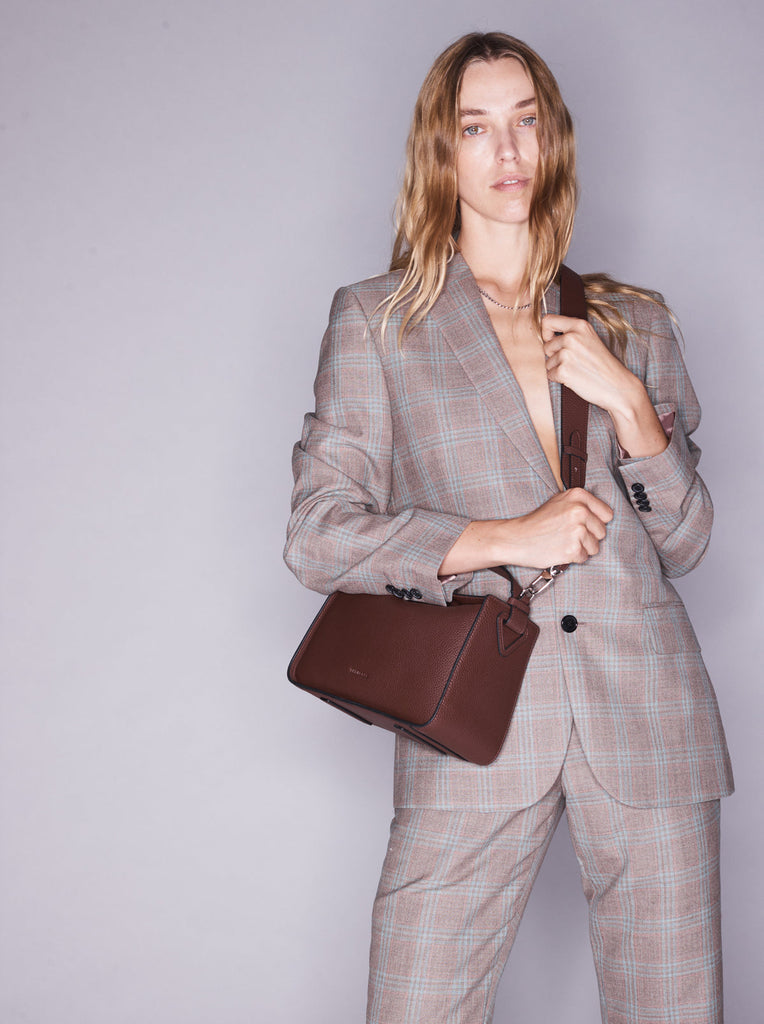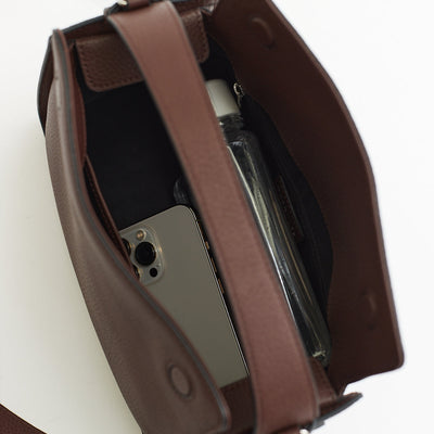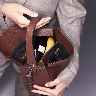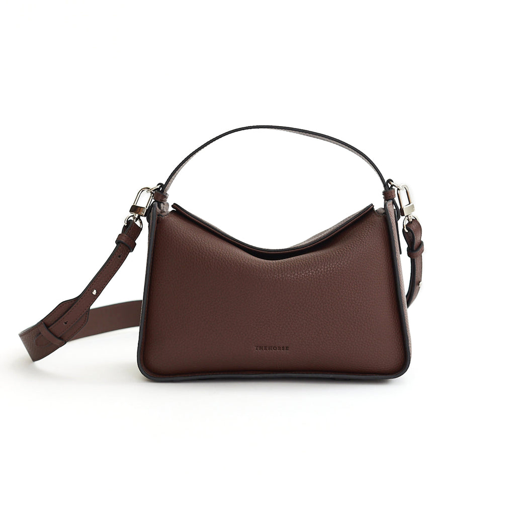 The Clementine Bag in Coffee by The Horse is the epitome of understatement. Made in soft, textured leather, the Clementine has hand-painted trims, including an adjustable wide strap to ensure it rests comfortably on your shoulder. There's plenty of space inside for your daily essentials. It has a flat base with protective feet and a curved top handle to sit unhindered on the shoulder or arm.