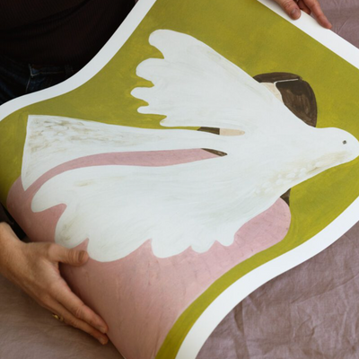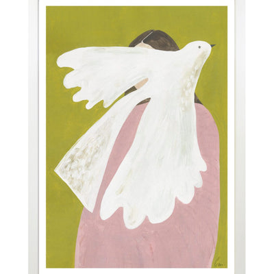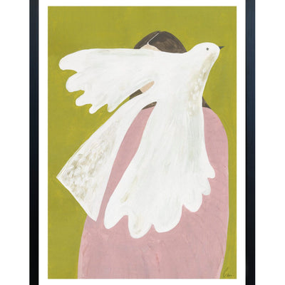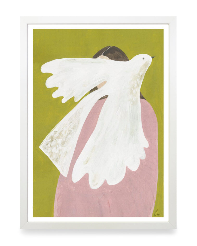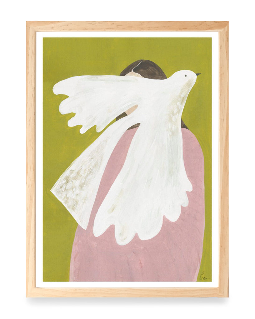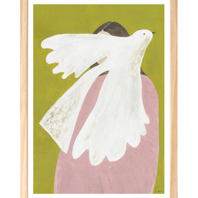 Bird and Woman art print by Clara Schicketanz for The Poster Club, Denmark. From her home in the outskirts of Berlin, artist Clara draws inspiration from the vibrant energy of the German city to create art that embodies tranquillity, urging viewers to slow down and reconnect.