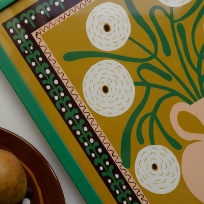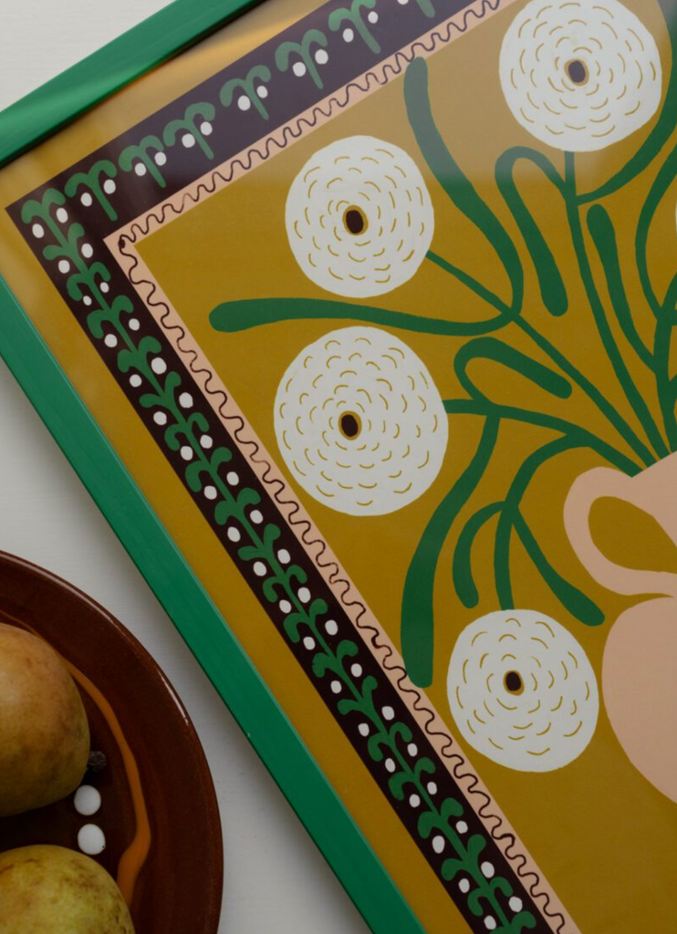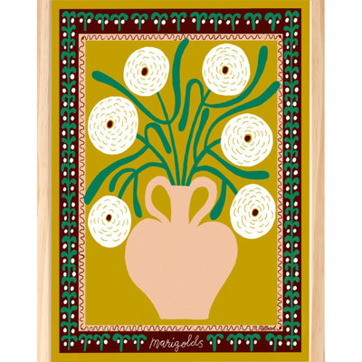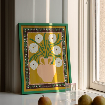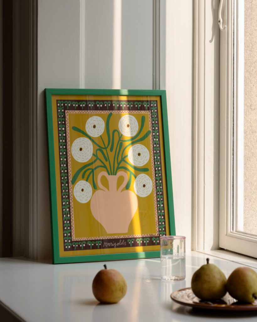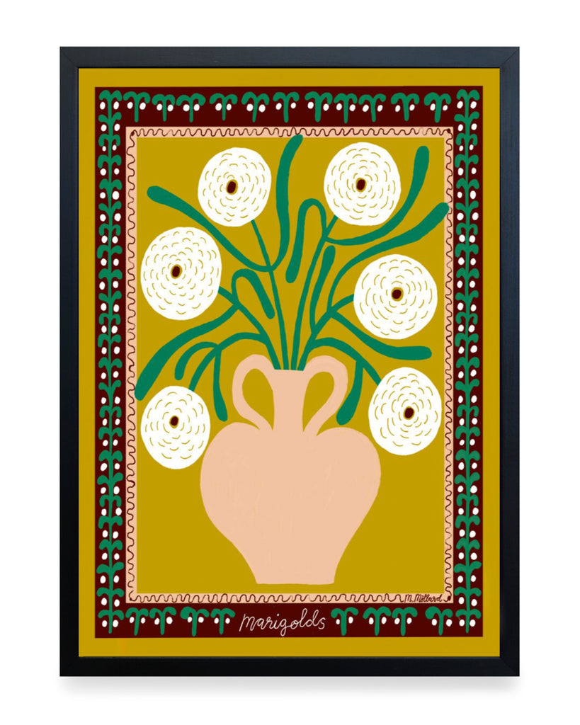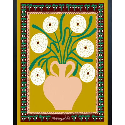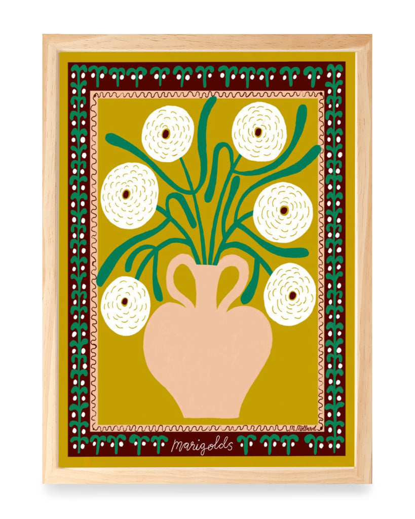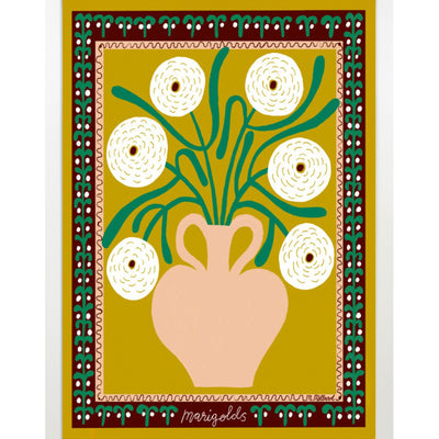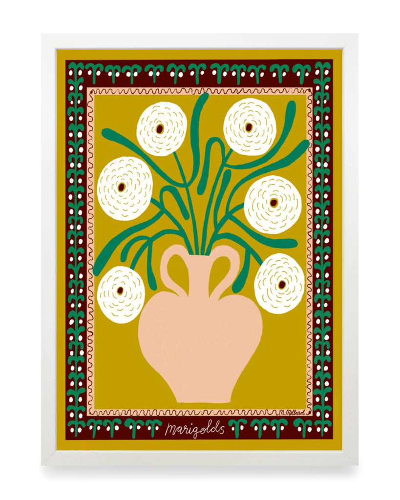 White Marigolds fine art giclée print by artist Madelen Möllard for The Poster Club, Denmark. Madelen, based in Stockholm, crafts vibrant, figurative art, drawing inspiration from diverse sources for her bold, colourful and dreamy creations.