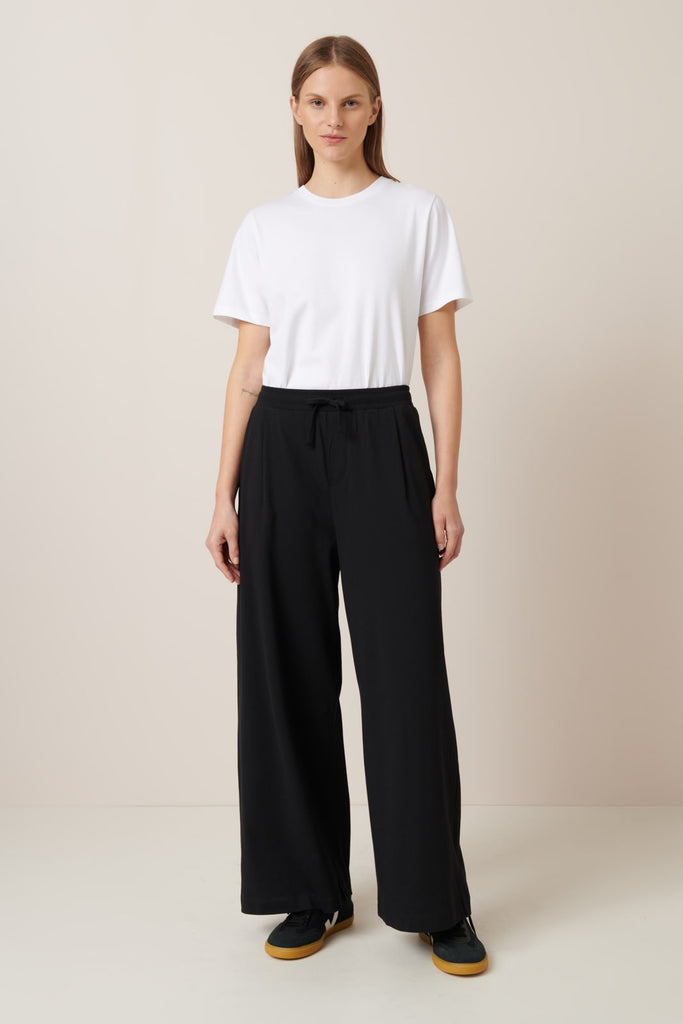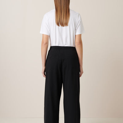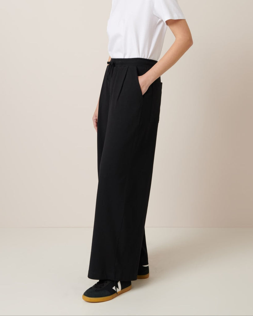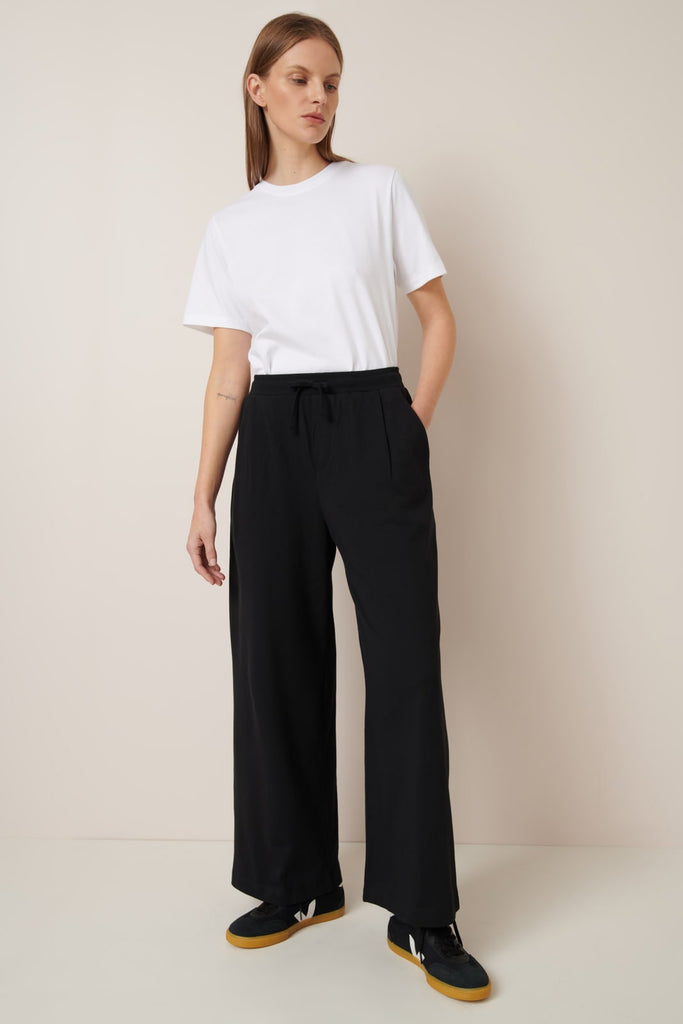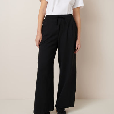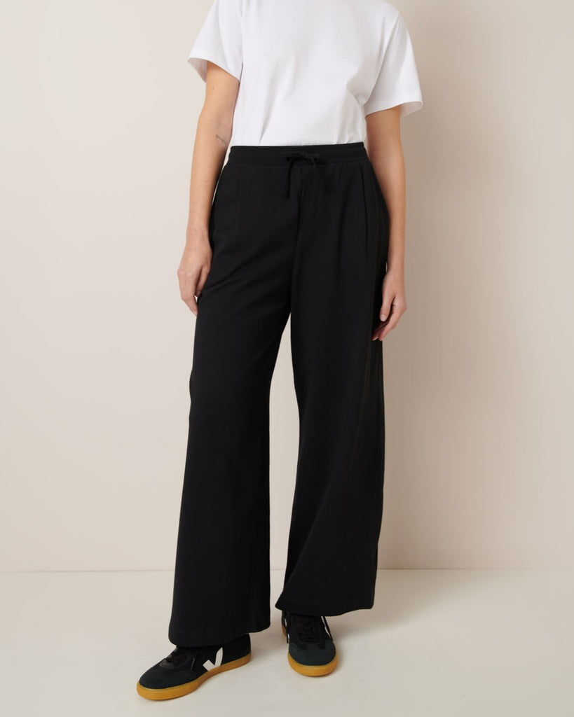 The Wide Leg Pants in Black by sustainable New Zealand clothing label, Kowtow feature front pleats and a relaxed fit. The pants have both front & back pockets and are finished with a ribbed elastic waistband and drawcord. A comfy mid-weight pair of pants - perfect for a casual day out.