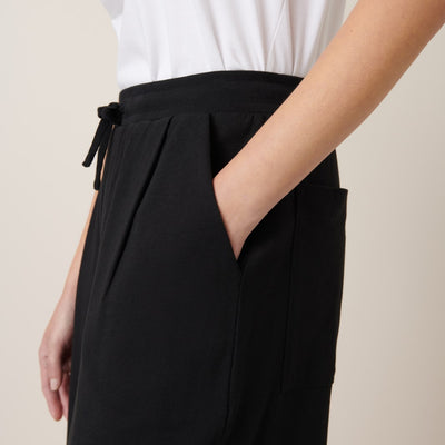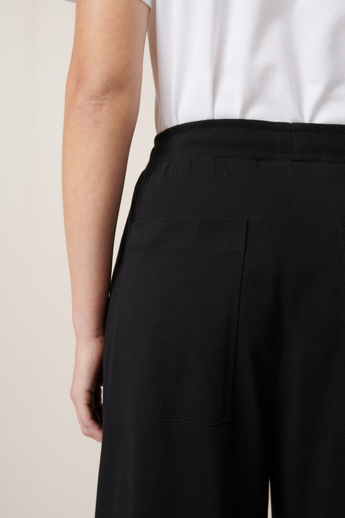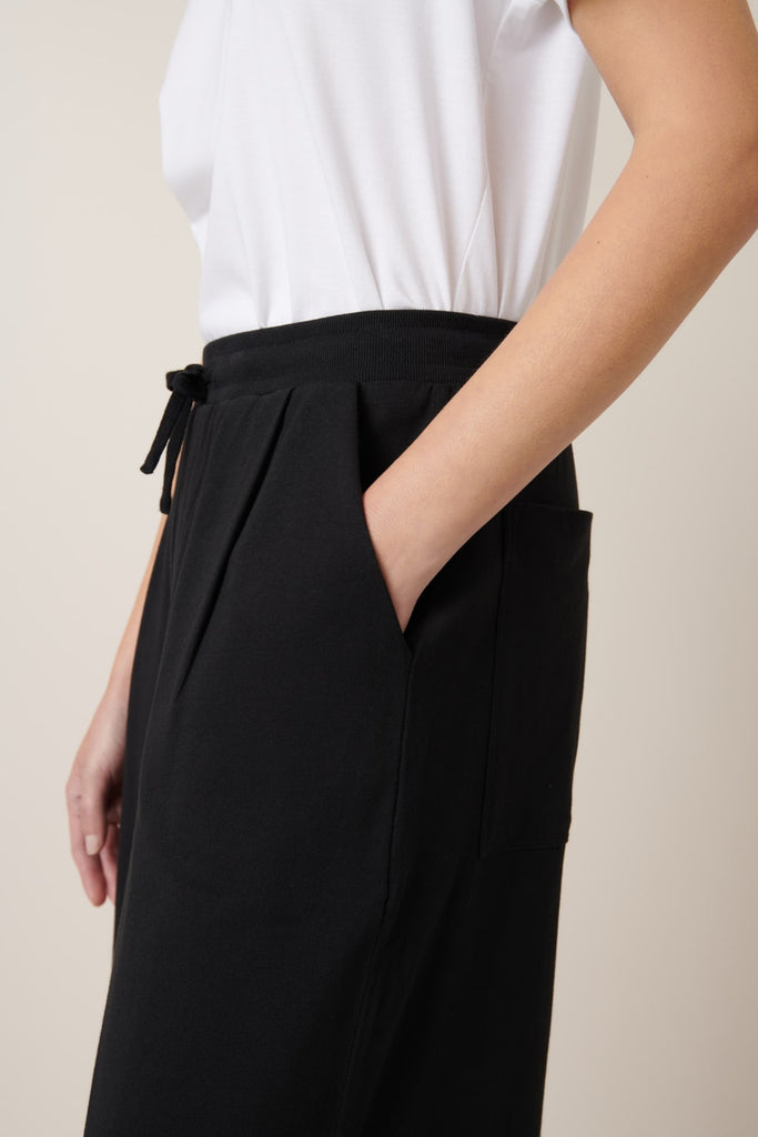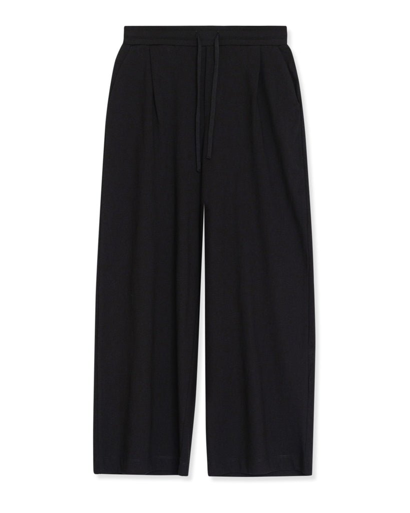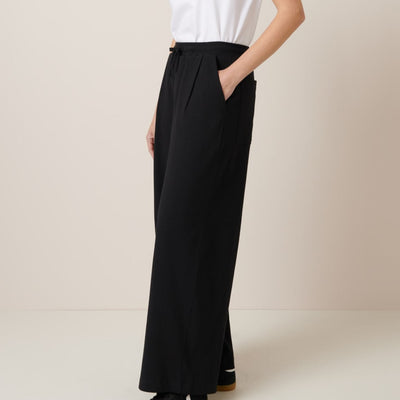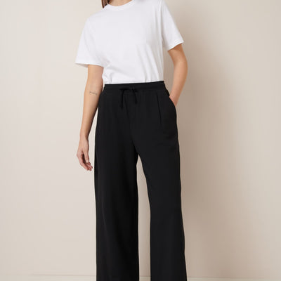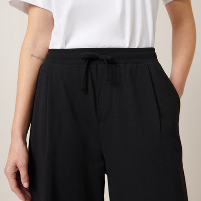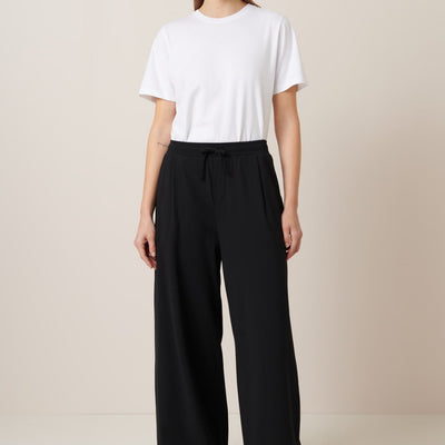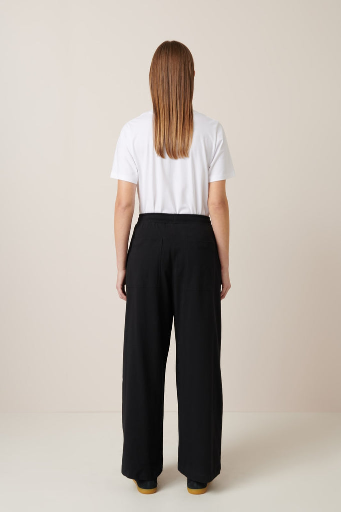 The Wide Leg Pants in Black by sustainable New Zealand clothing label, Kowtow feature front pleats and a relaxed fit. The pants have both front & back pockets and are finished with a ribbed elastic waistband and drawcord. A comfy mid-weight pair of pants - perfect for a casual day out.