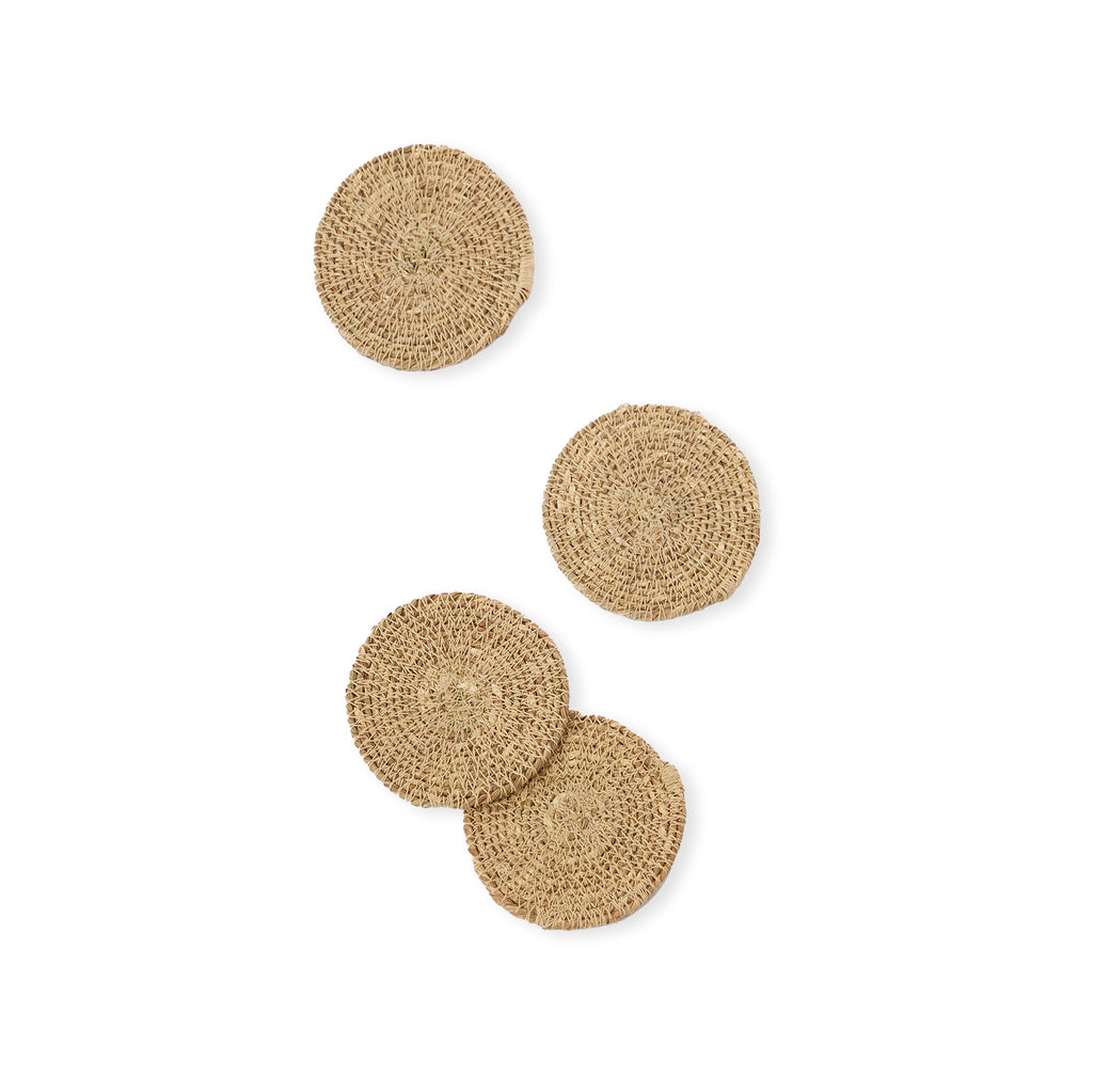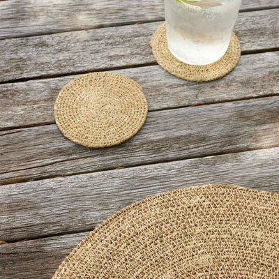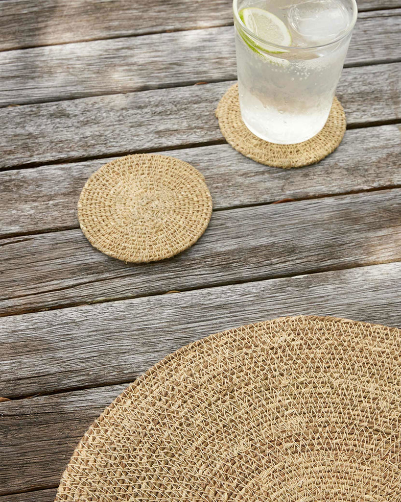 The coasters are handwoven in India using natural seagrass. Traditional weaving techniques celebrate the craftsmanship and create a unique, organic finish.