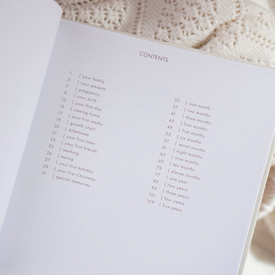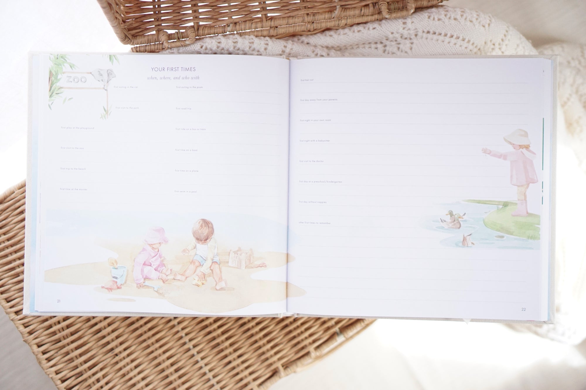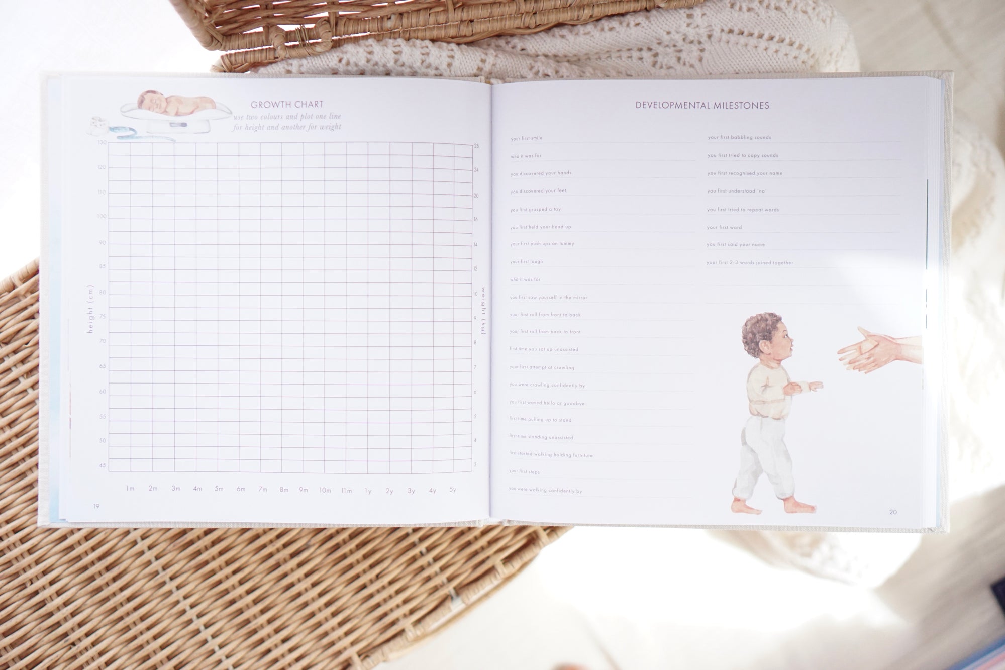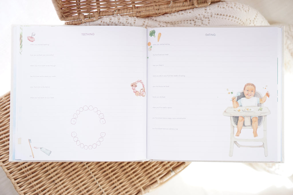 A childhood memory journal designed for all new parents to use, enjoy, and one day look back on. From baby’s family and friends, arrival and first days, right through to age five, every page is unique, with developmentally appropriate journal prompts and illustrations to inspire parents to write. All memories, celebrations, special moments and milestones are included, together with guided journal pages for months and years.
