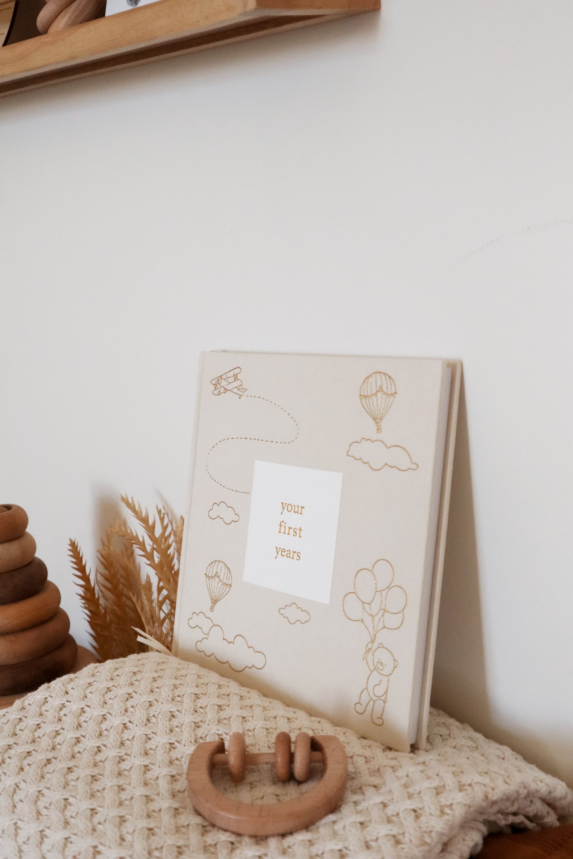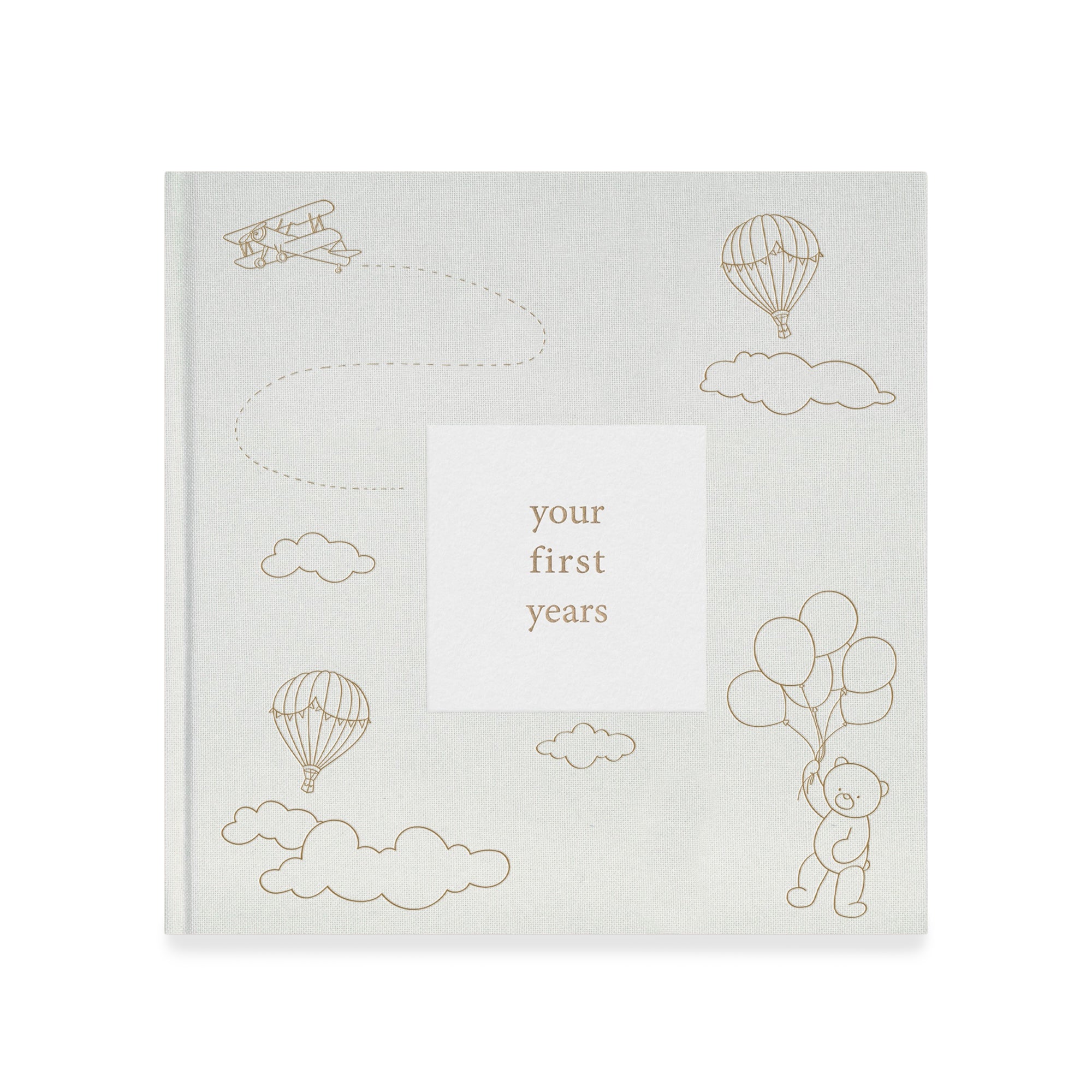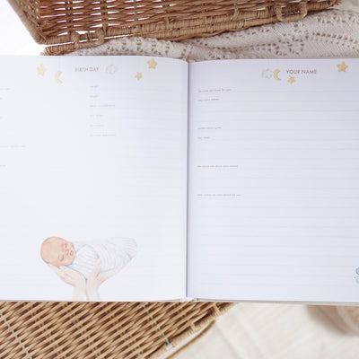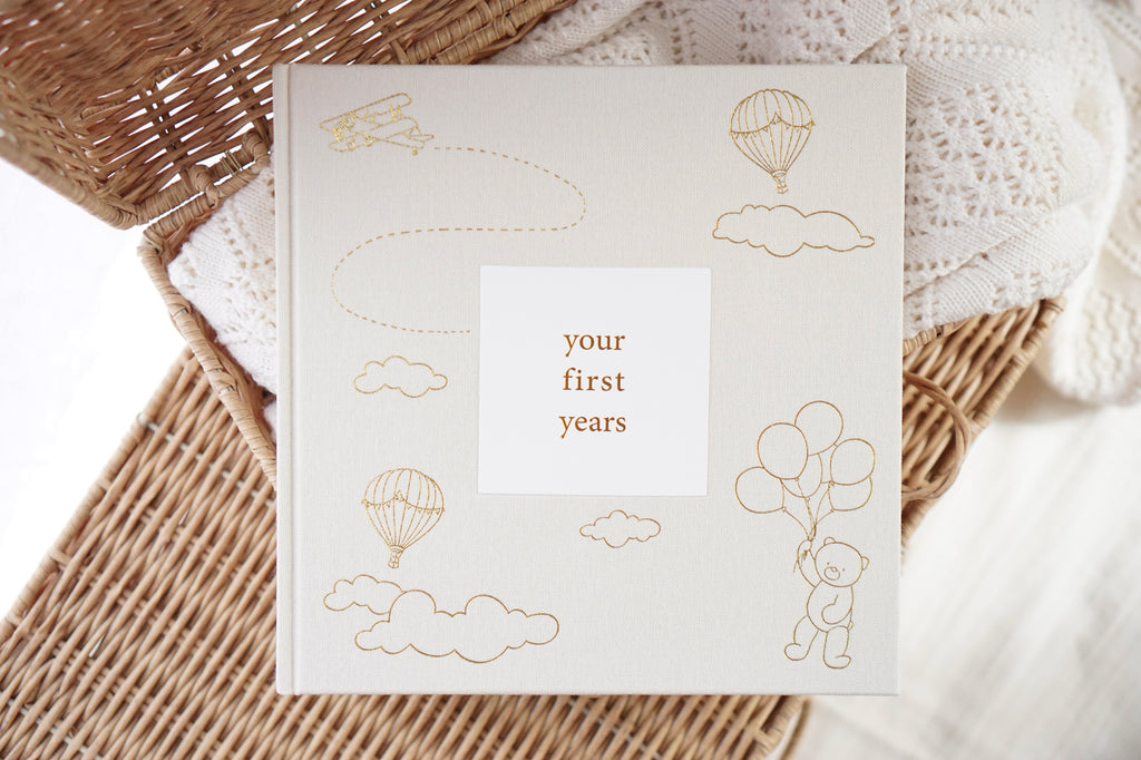 - 120-page linen hardcover baby book with gold foil cover detailing