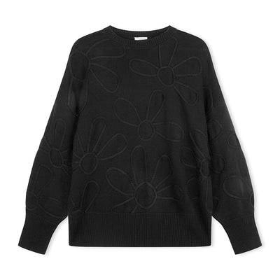 The Black Applique Knit Jumper by Zulu & Zephyr is the must-have piece of the season. Crafted from a luxurious black knit, it showcases a bold flower applique design on both the front and back. Featuring a classic crew neckline and long relaxed sleeves with rib cuffs and hem, the knit exudes both elegance and comfort.